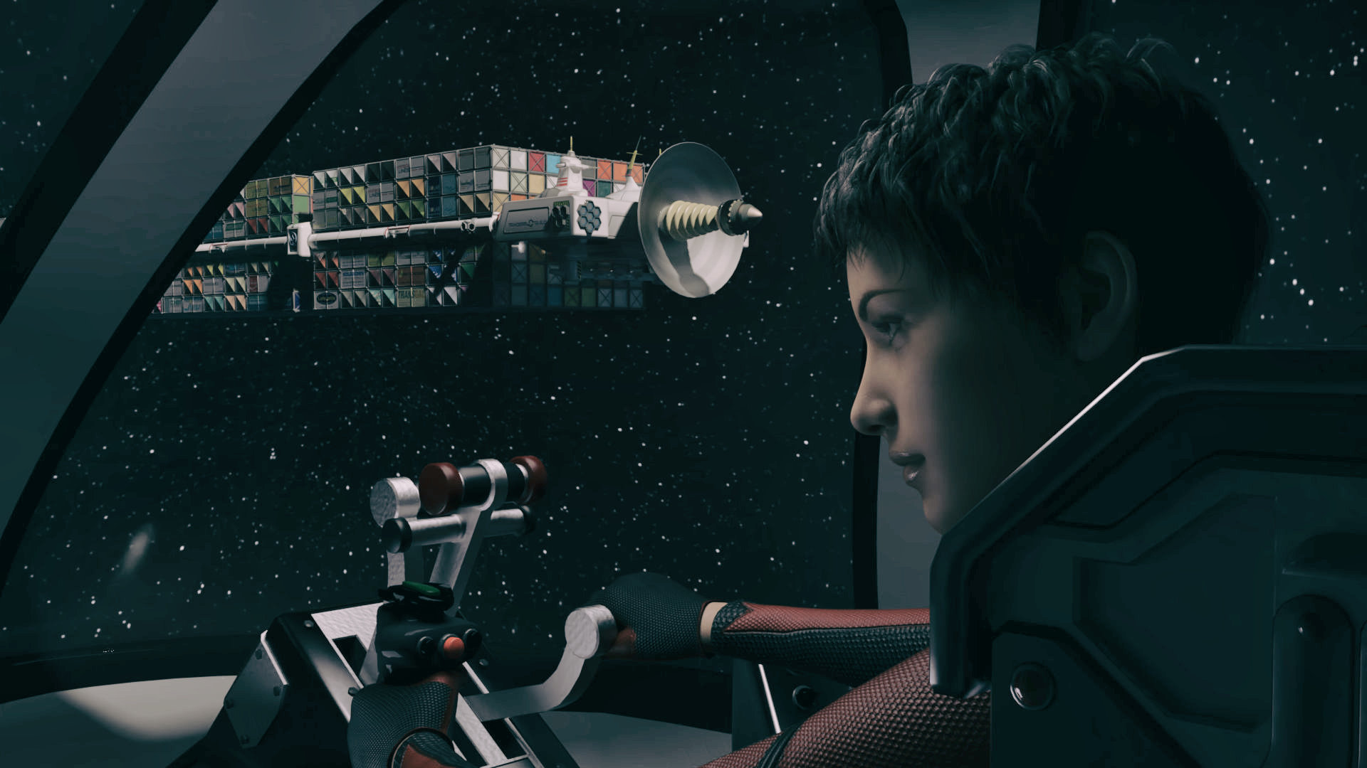 Es war eine richtige Herausforderung mit dem Licht und auch um ihr Gesicht zusammen mit das Containership darauf zu kriegen. Sie schaut jetzt auf einen Monitor und nicht zum Containership hinüber.