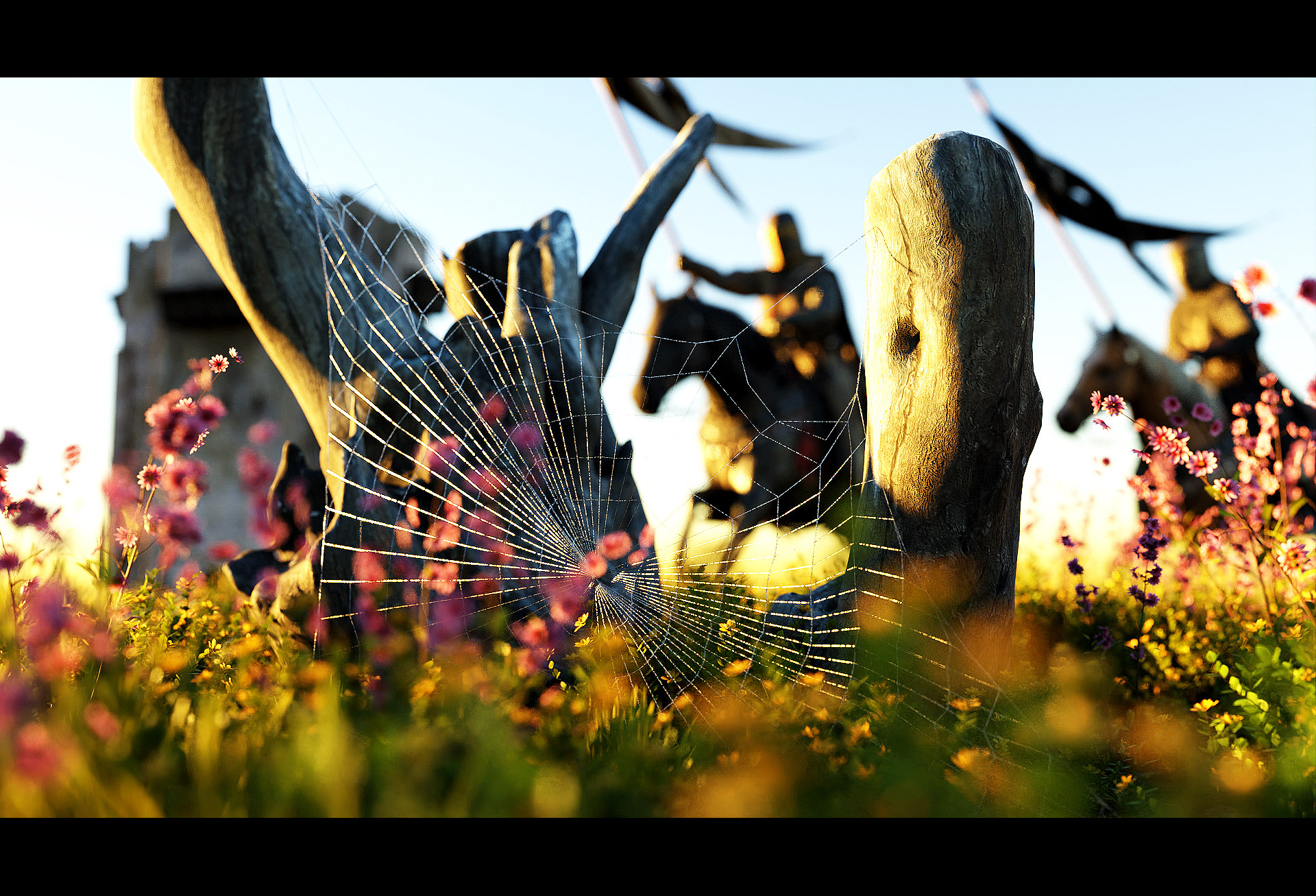Toll gemacht mit dem Spinnennetz für eine Szenenblende in einem Film, um den Fokus aus dem Nahbereich auf die Action im Hintergrund zu lenken. Sehr beliebtes Stilmittel in Filmen, die einen richtig guten Kameramann am Set haben.