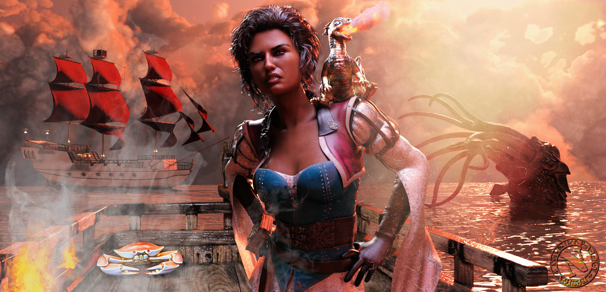 Der kleine Drache hat aus Versehen mit einem Niesanfall das Schiff angezündet (Krabbenallergie, wofür die kleine Krabbe wiederum auch nichts kann