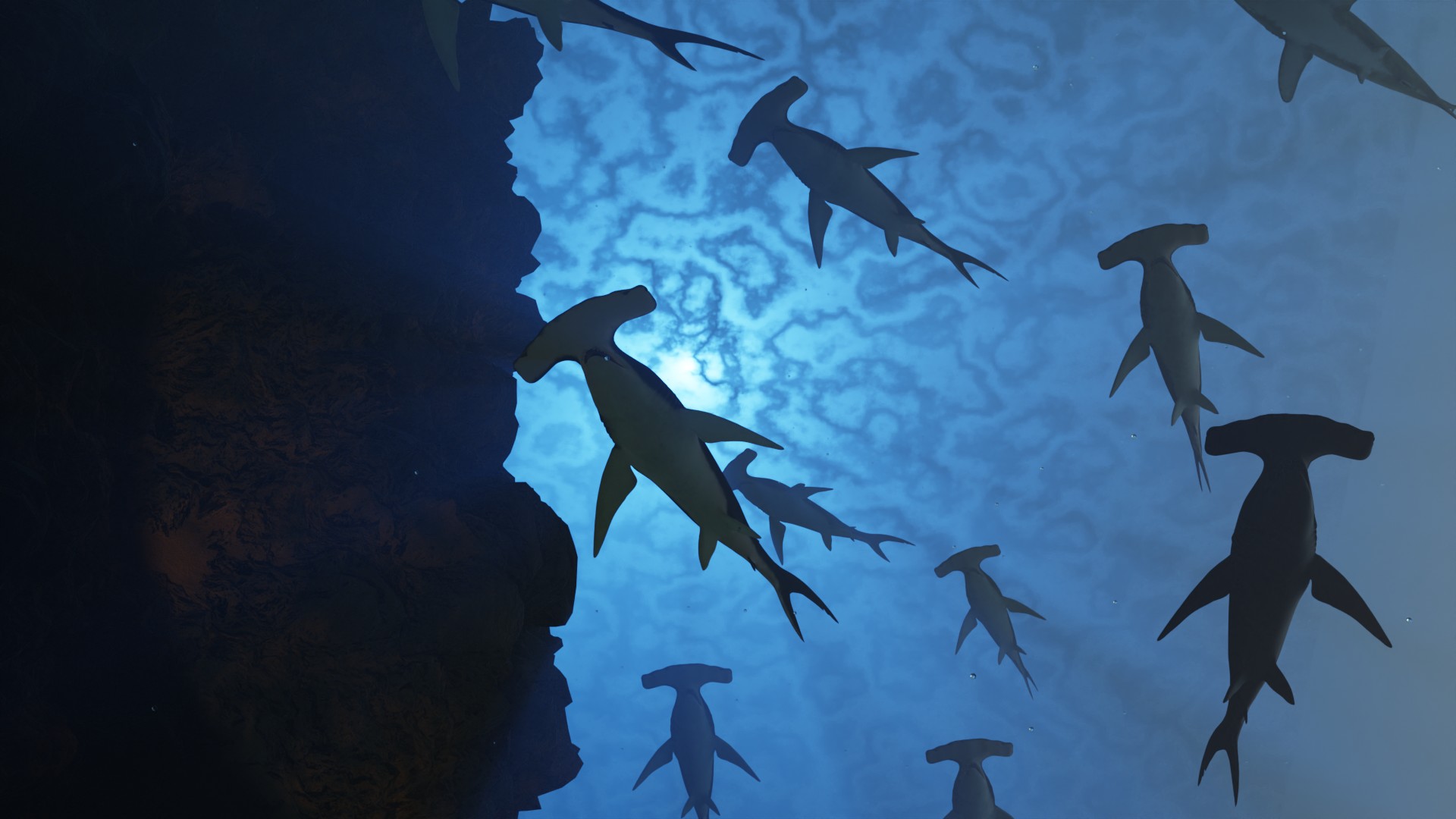 Einige Arten des Hammerhais können sich zu Gruppen von vielen hundert Individuen zusammenschließen. ![]()