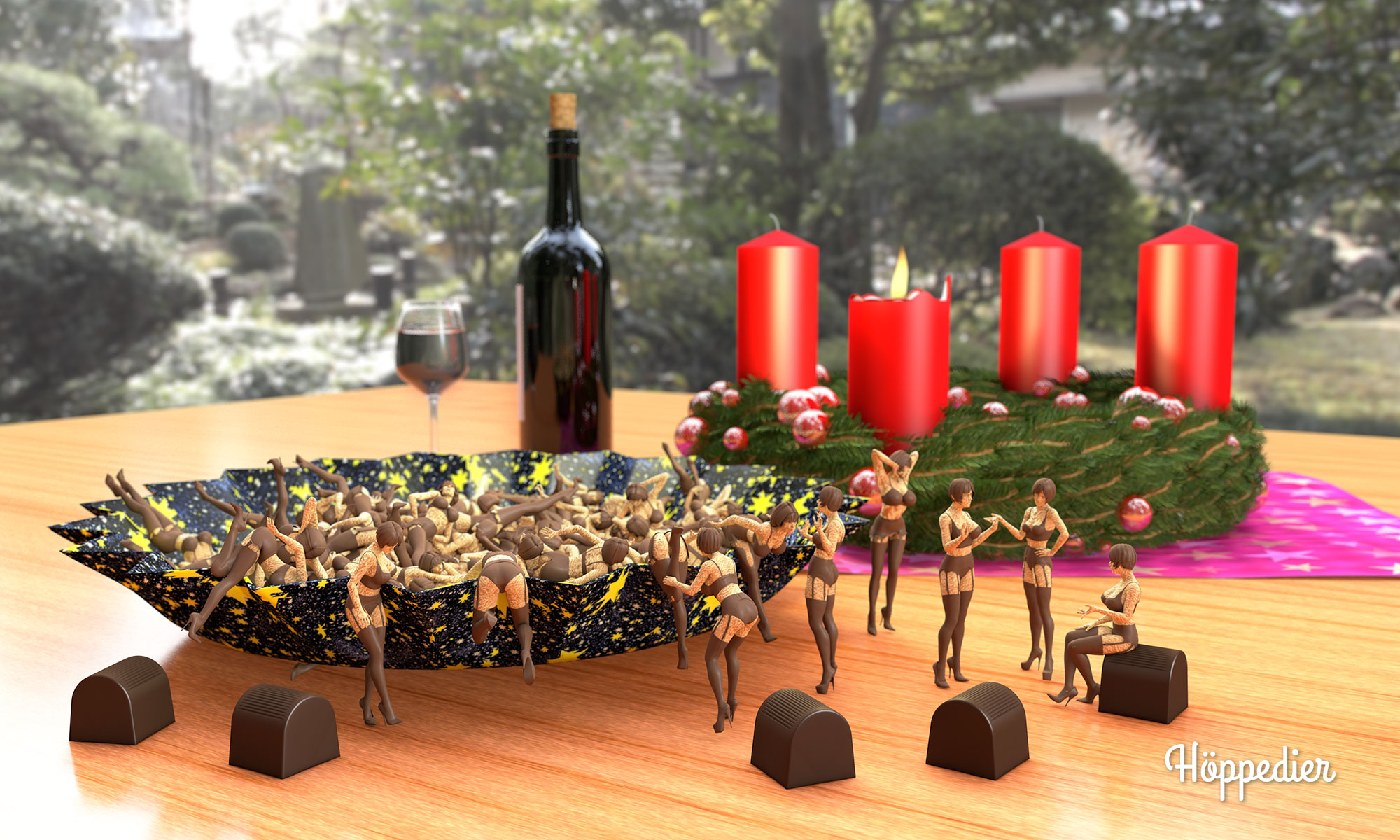 Moddeling des Tellers, Adventskranz, Kerzen und Pralinen in C4D.