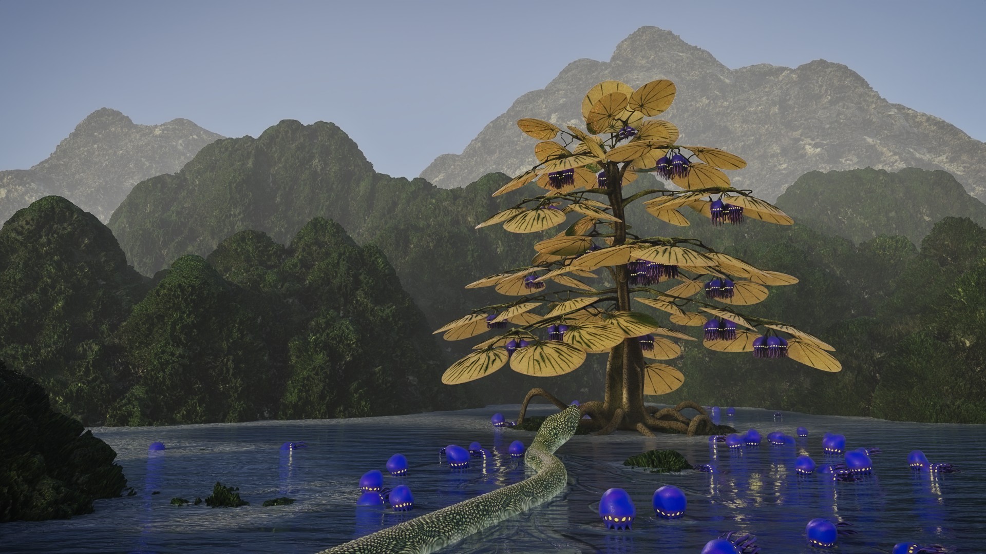 Landschaft mit dem ANT-Editor von Blender, Texturen zum Teil vom Genetica-Viewer und vieles ist procedural.