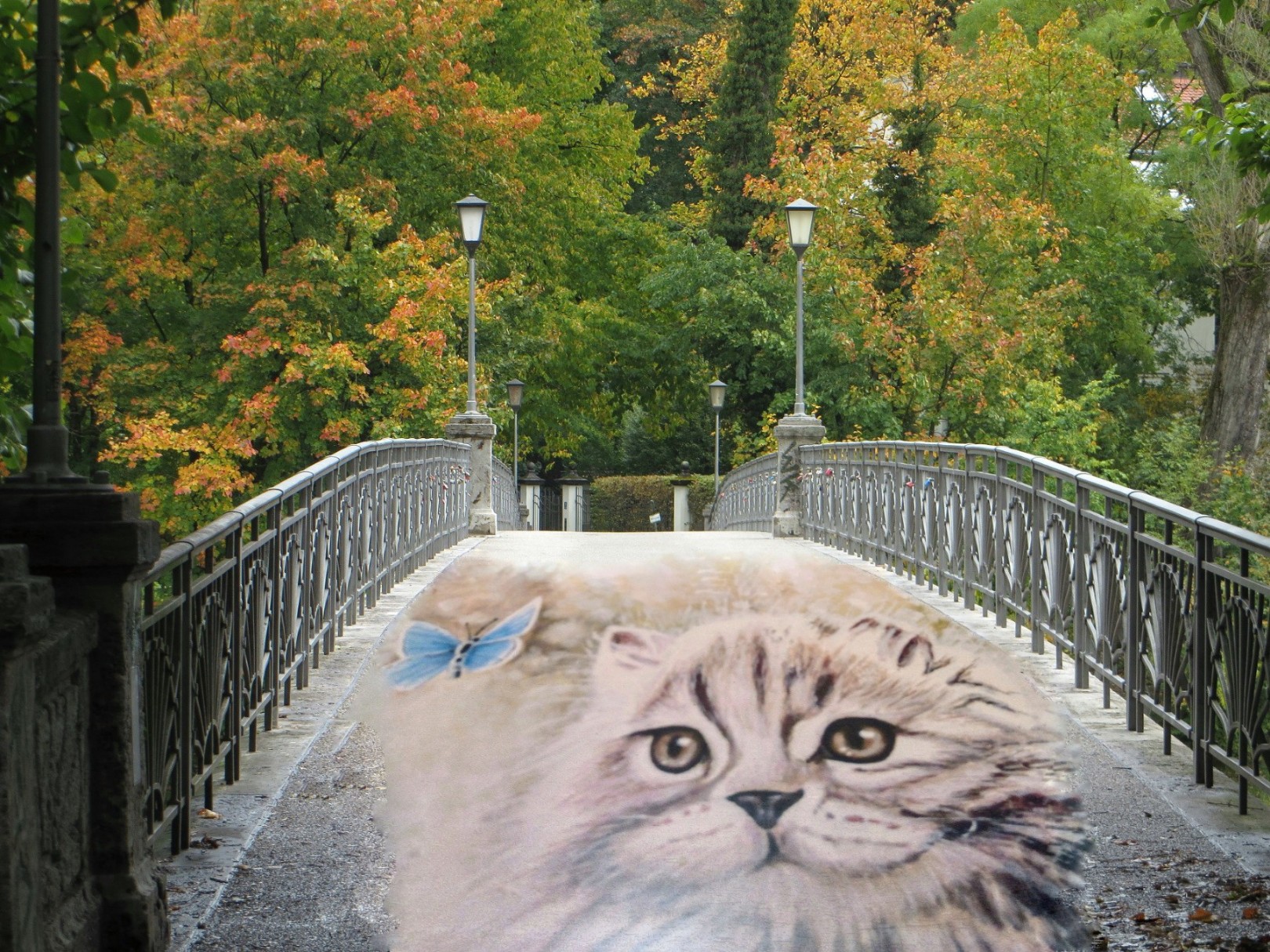 Da ich gerne Collagen mit Fotos mache, kam mir die Idee, dieses Katzenbild als Strassenbild zu probieren. Ich kopierte dann das Katzenbild auf den Steg!!