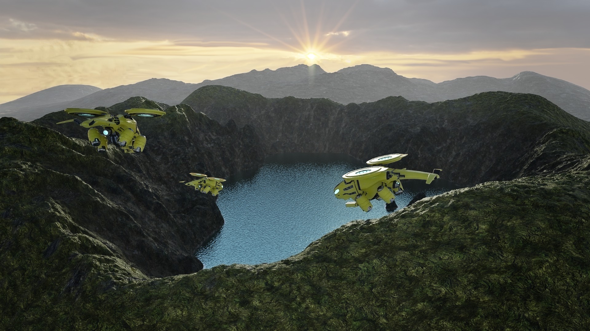 Angaben zu Texturen: Für die Landschaft vom Genetica Viewer, für die Copter: Filterforge und procedural. HDRI aus der Blender Cloud