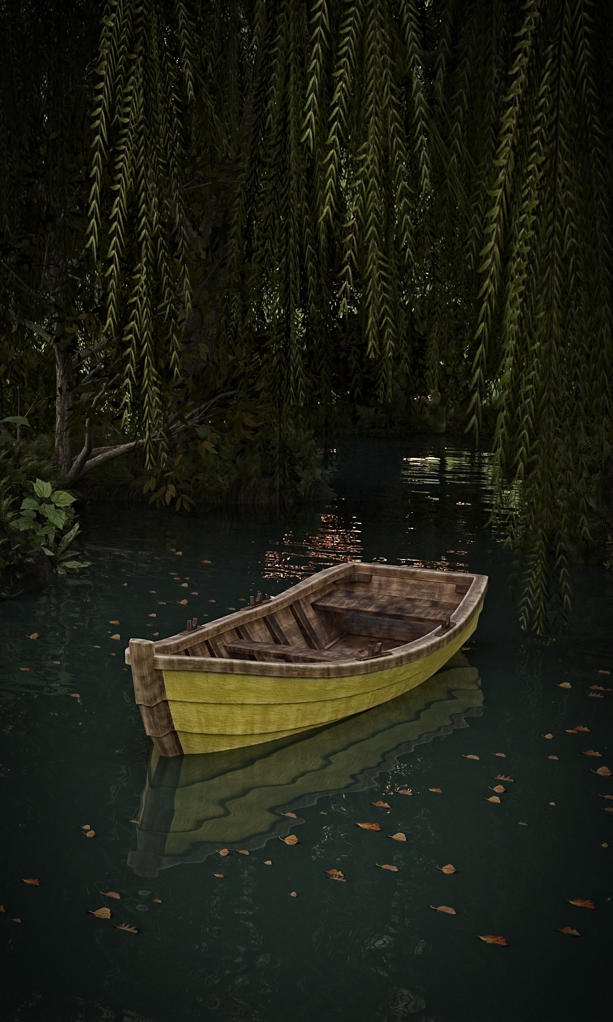 Modeling-Zeit: 40 Minuten Boot + Landschaft, Uferbewuchs + gefallenes Laub aus meinem selbstgemachten Bestand, Bäume von Sequoia