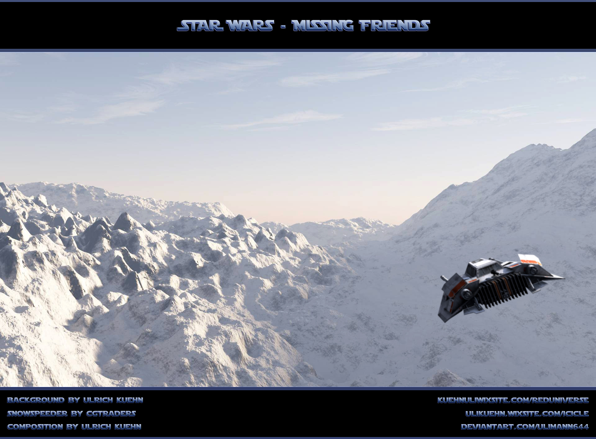 Das Bild zeigt den T-47 Luftgleiter von Wedge Antilles, bekannt als ECHO 2 (im Original als ROGUE TWO), der über die Oberfläche von Hoth rast, auf der Suche nach Han Solo und Luke Skywalker.