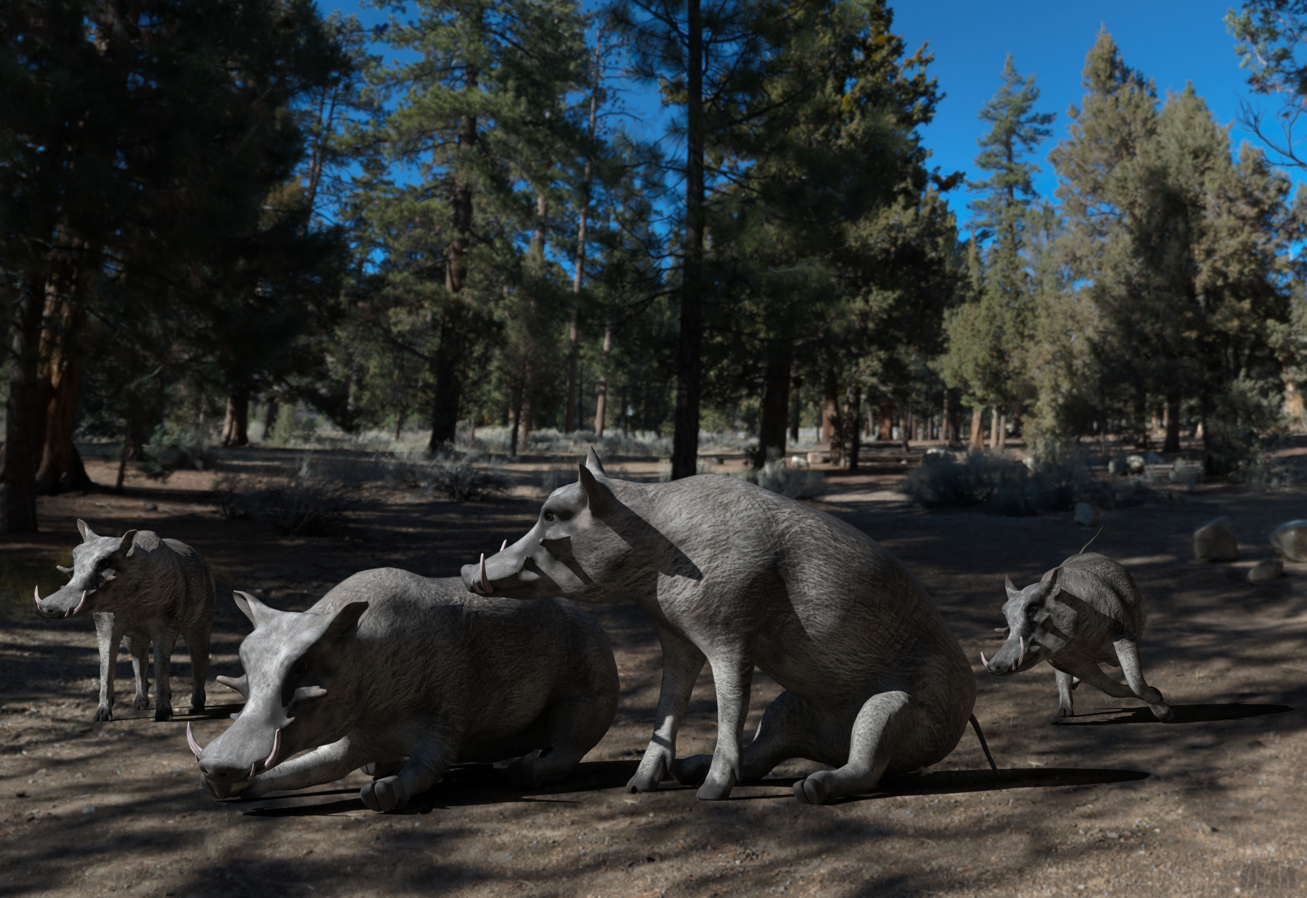 Die Schlammsuhle scheint schon zu trocken zu sein. Der Wald kommt sehr gut, die Schweine auch. Ein paar richtige Haare würden ihnen aber noch besser stehen.