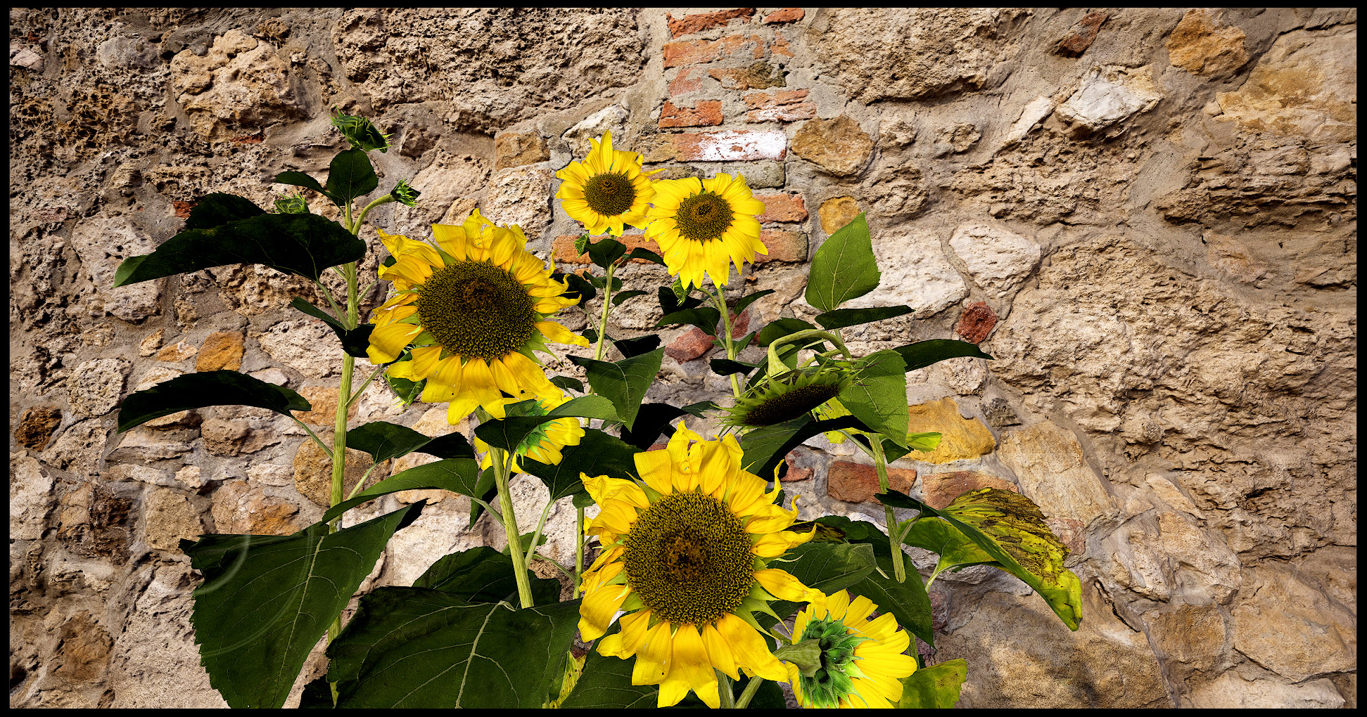 Sind schon sehr real, diese Sonnenblumen. Falls man das beeinflussen kann, rechts geht einer der Stiele direkt durch ein Blatt. Ansonsten hervorragend