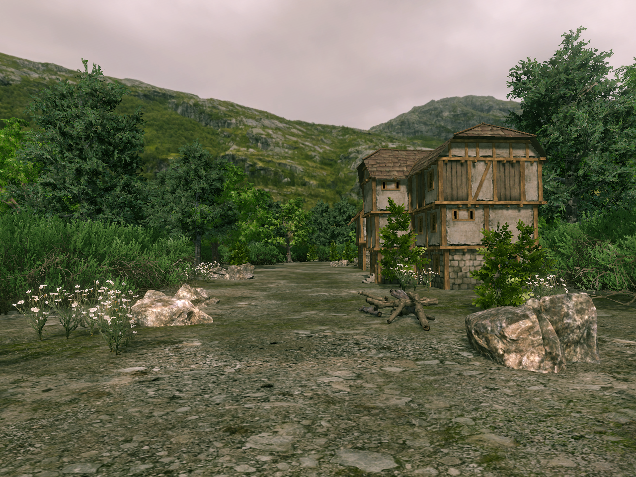 Landschaft und Häuser. Heute Abend eine Kamerafahrt