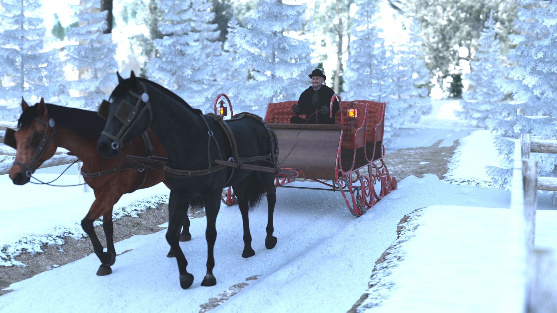 Vielen Dank noch mal an JoBo für den schönen Schlitten. Ohne Zaumzeug aus Blender importiert und dann lackiert, mit Zaumzeug von DAZ Horse 3 versehen. Das passt dann halbwegs.