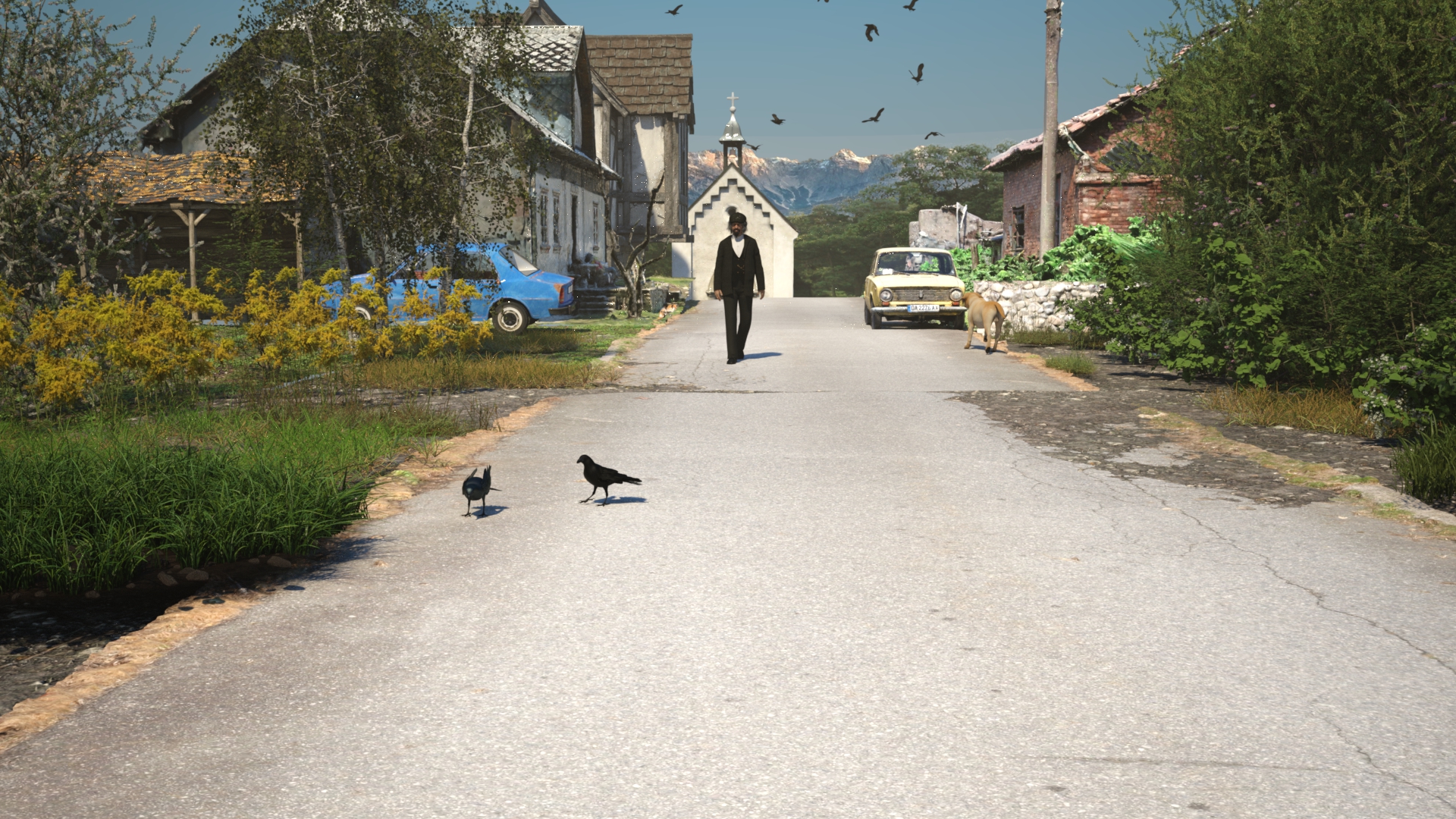 Die Gebäude und die Straße sind 3D Scans von Blenderkit, in DAZ importiert. Dann zwei Backgrounds (Gebirge und Wald) von DAZ. Planzen auch DAZ. Lebewesen auch. Der Lada (rechts) und der Skoda 105 sind auch 3D Scans von Blenderkit.
