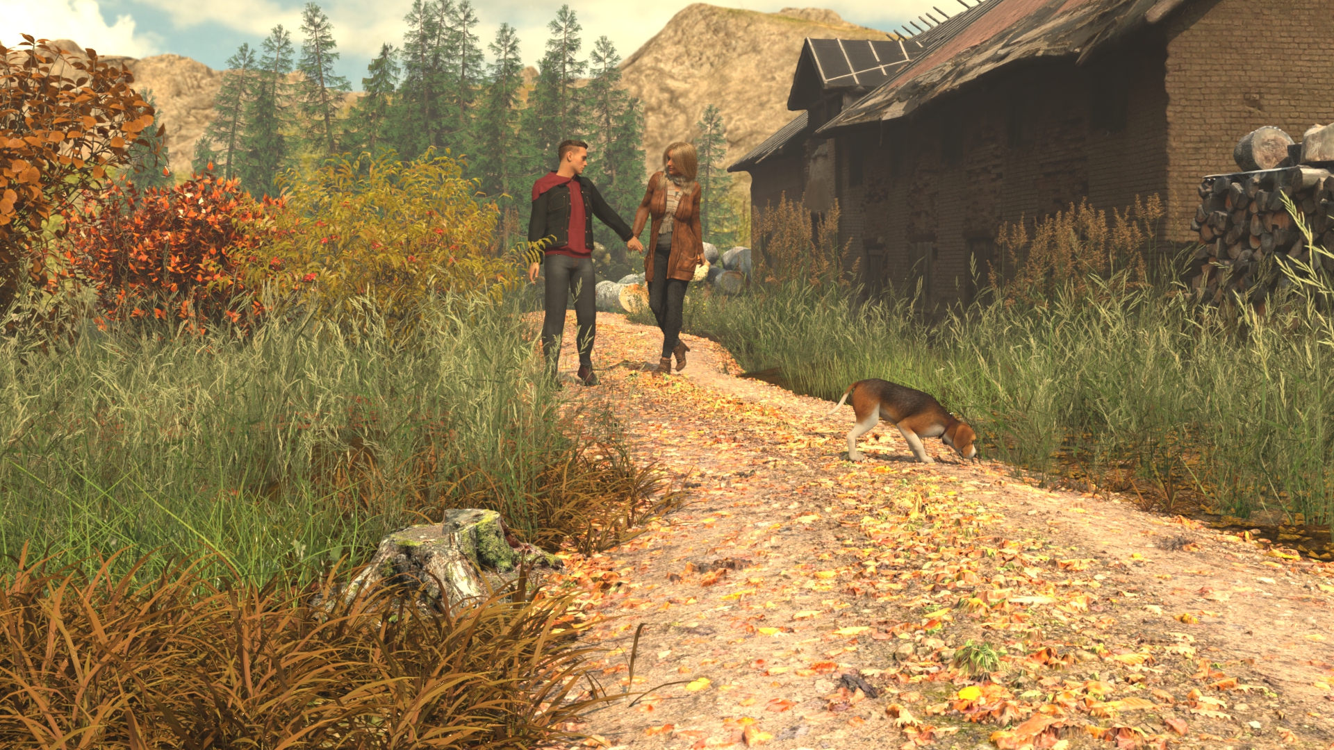 Holzstapel, Baumstumpf, Weg und Forsthaus Scans von FAB importiert, der Rest Diverses von DAZ. Das klappt meistens super mit dem fbx- Import und dann gibt es auf verschiedenen Webseiten Unmengen an kostenlosem Content. Da kann man mit der Gestaltung Wochen zubringen.