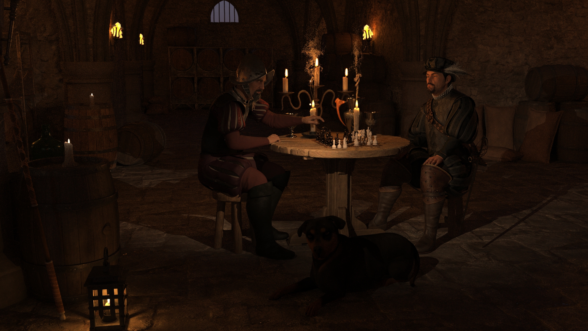 Der Nachtwächter hat im Morgengrauen seine Runde beendet und trifft sich noch auf ein kleines Spiel und ein Tässchen vom Roten mit dem Edlen Gunther von ....., der auch nicht schlafen kann. Beide sind leidenschaftliche Schachspieler.