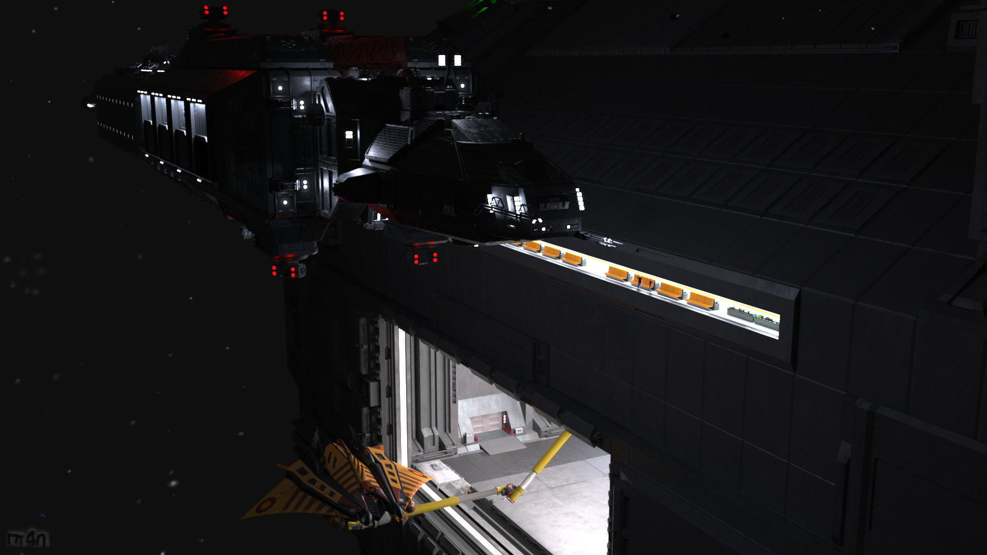 Ein großer Carrier dockt an einer Raumreiseraststation im Weltraum an, während ein Greifarm einen Jäger ins Innere holt. Zwei Personen beobachten den Vorgang aus der hell erleuchteten Raststation.