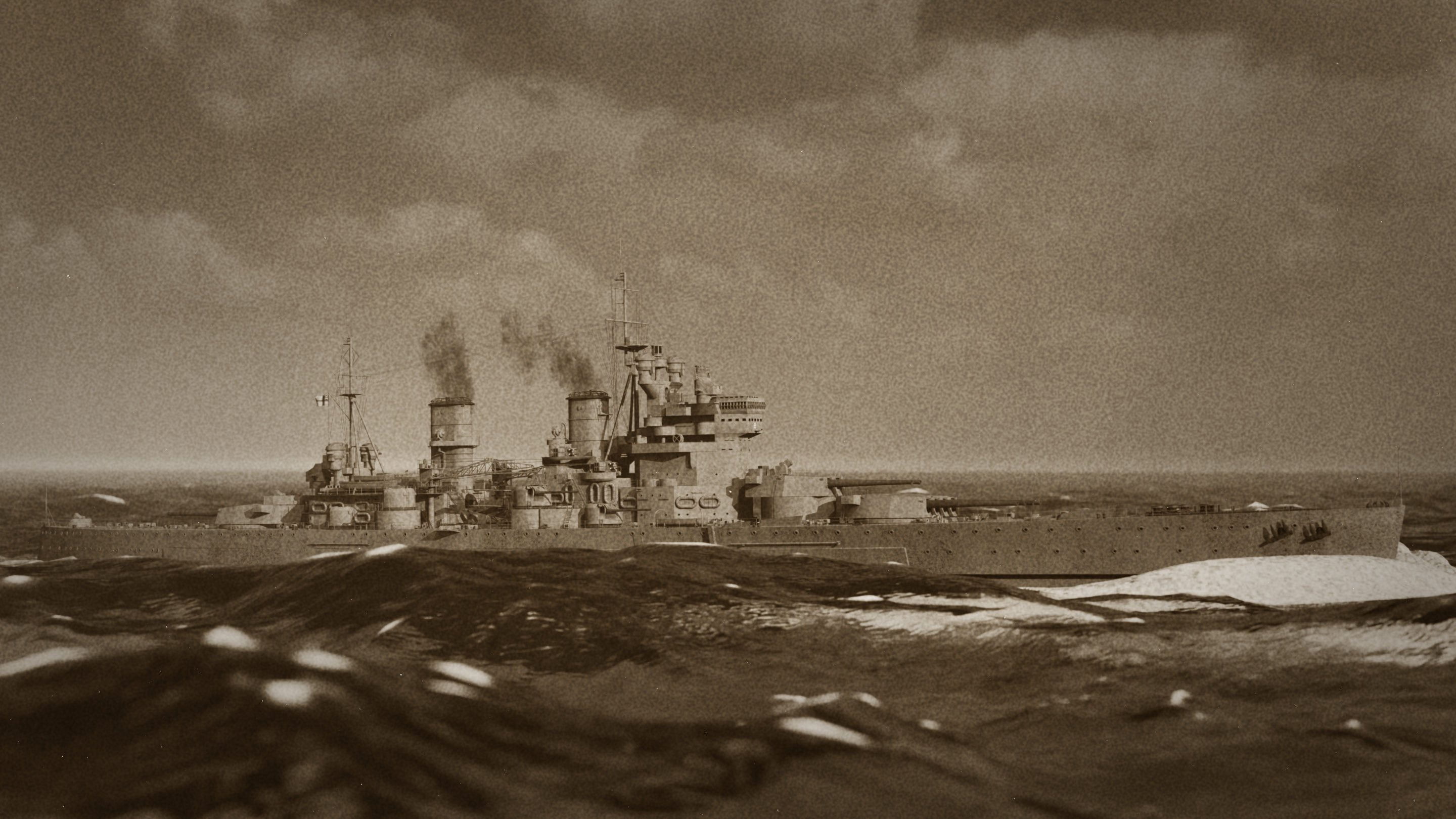 Ich habe das Gefühl, dass Du das falsche Schiff ausgewählt hast. Die Prinz Eugen, die Du verlinkt hast, hatte doch vier große Geschütztürme - zwei vorne, zwei hinten. Das Schiff auf dem Bild hat hinten aber nur einen und dann auf den Aufbauten an der Seite Schlauchboote und oben drauf vermutlich die Radaranlage. Da ist kein Platz für einen vierten Turm... Zwei Schornsteine sehe ich auf dem Bild - Prinz Eugen hatte einen länglichen, der nach hinten oben leicht gekrümmt war. Naja, und dann halt die britische Flagge...