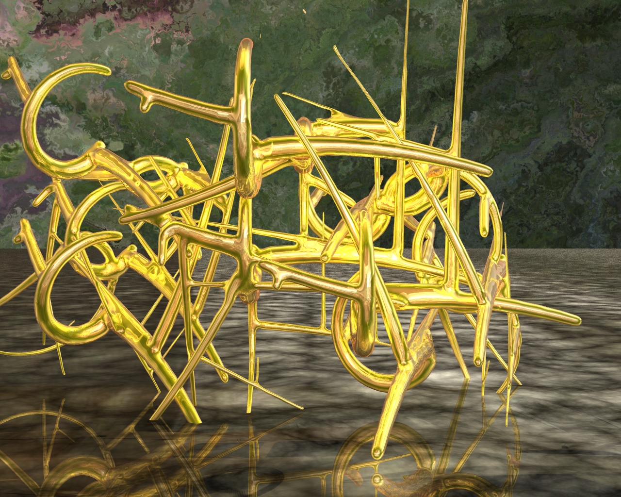 Ich habe mir jetzt Groboto zugelegt und damit mal ein abstraktes Objekt erstellt und in 3DCoat remeshed. Zum Test habe ich das einfach auf eine spiegelende Ebene gelegt und im Hintergrund ist ein Foto von einem Baum im Wald, welches über einen Fraktaldeformer wie ein Ölgemälde wirkt. Gerendert wurde das ganze mit Messiah.