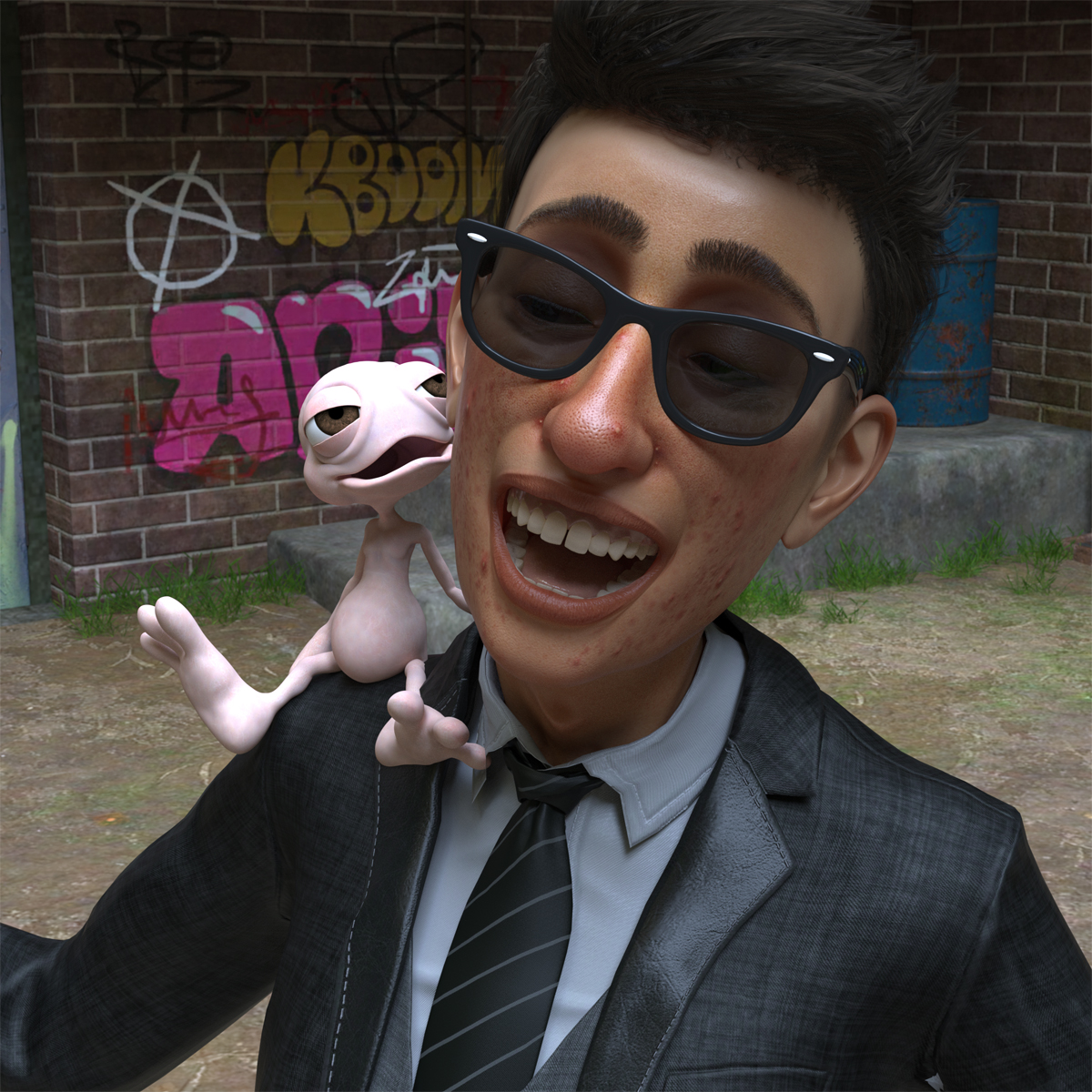 Vielleicht ist es in wirklichkeit aber nur einer und der Rest findet nur in seinem Kopf statt... Ich meine, schau Dir den doch mal an mit seiner blassrosa Haut. Da ist es doch nur verständlich, wenn er sich als Transportmittel so einen bebrillten Menschen vorstellt