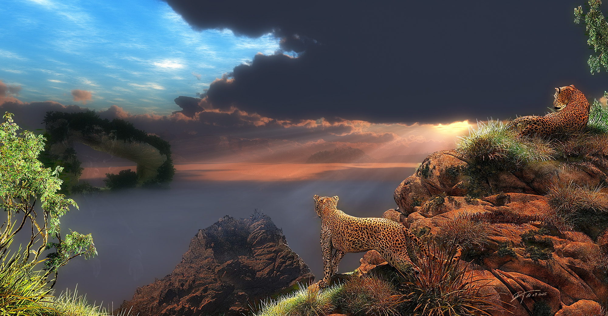 . Diese aufragende Felsformation links Mitte ist allerdings nicht ganz passend, zu weich. Sollte kantiger sein, wie der, der vor den Leoparden aufragt. Das ist aber meine persönliche Sicht auf das Bild.
