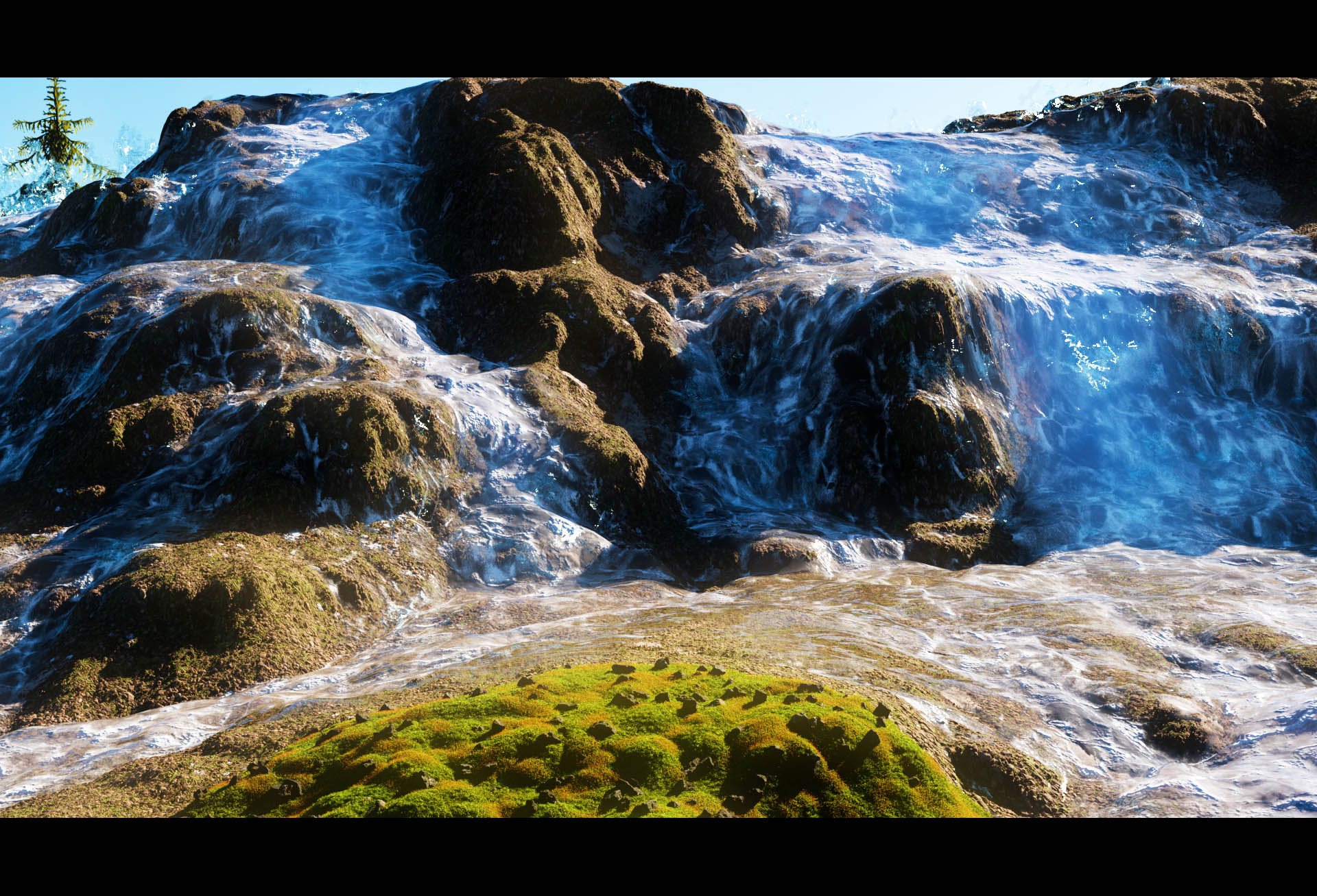 ) Die ist zwar teilweise an den steileren Stellen etwas in der Höhe angepasst, damit der Eindruck fallenden Wassers entsteht, aber läuft an anderen Stellen auch quer zur Fallrichtung, was irgendwie nicht richtig aussieht. Es hat ein bisschen was von einer HDR-Aufnahme, wo verschiedene Bilder mit verschiedenen Belichtungszeiten übereinandergelegt werden. (Man sieht relative scharfe Wasserspritzer und lang gezogene Schlieren) An den Stellen, wo zwischen dem Moos nur ein wenig Wasser durchsickert, würde normalerweise nicht so viel Schaum entstehen (auch wenn sich das optisch gut macht in dem Grün