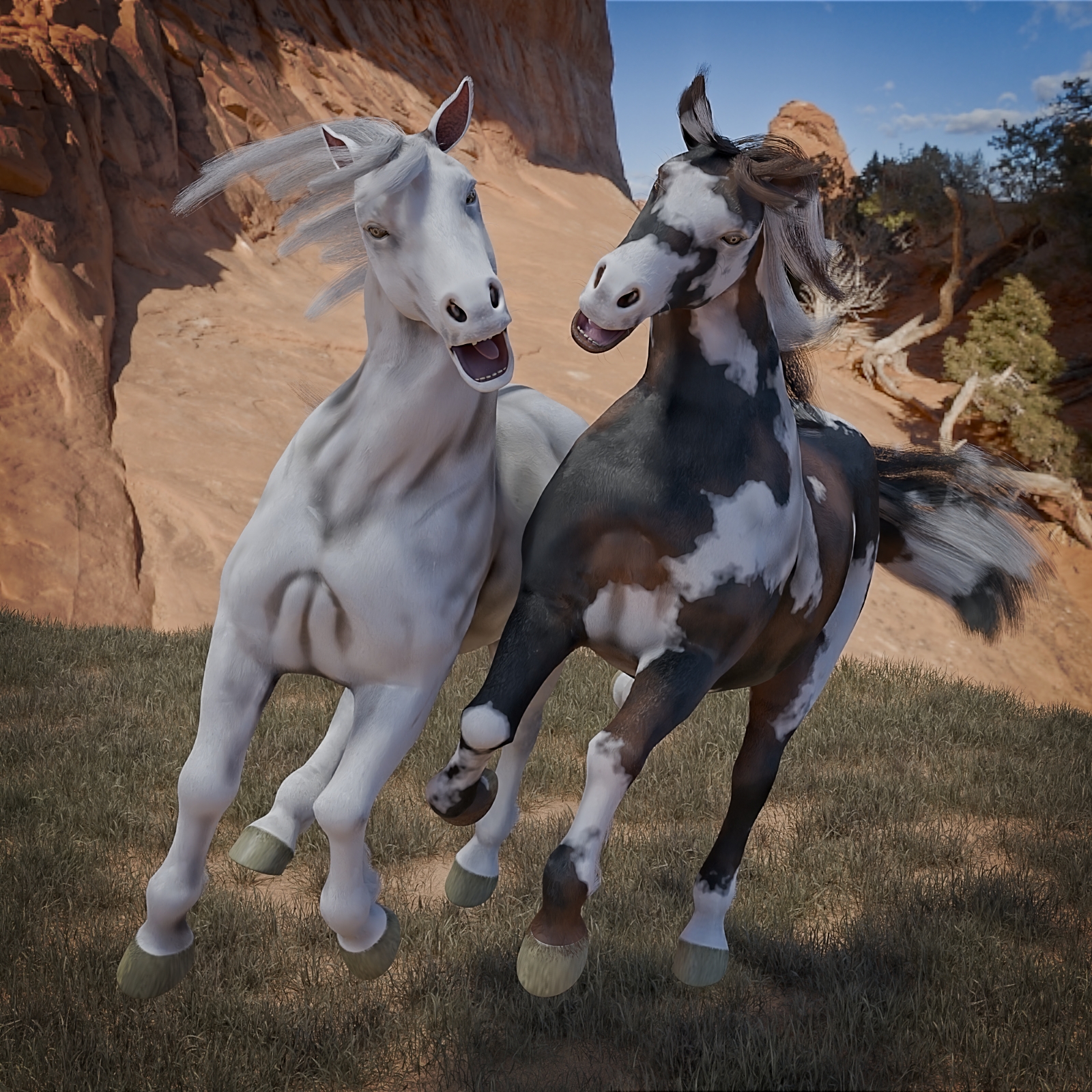 Eins hab ich noch gemacht. Die Fellfarben etwas geändert und da es zwei Hengste sind, gibt es da immer wieder Streitereien. Der Denoiser hat die Fellstruktur etwas weggelutscht, obwohl ich ihn schon runtergedreht habe. Renderzeit war über 3 Min.