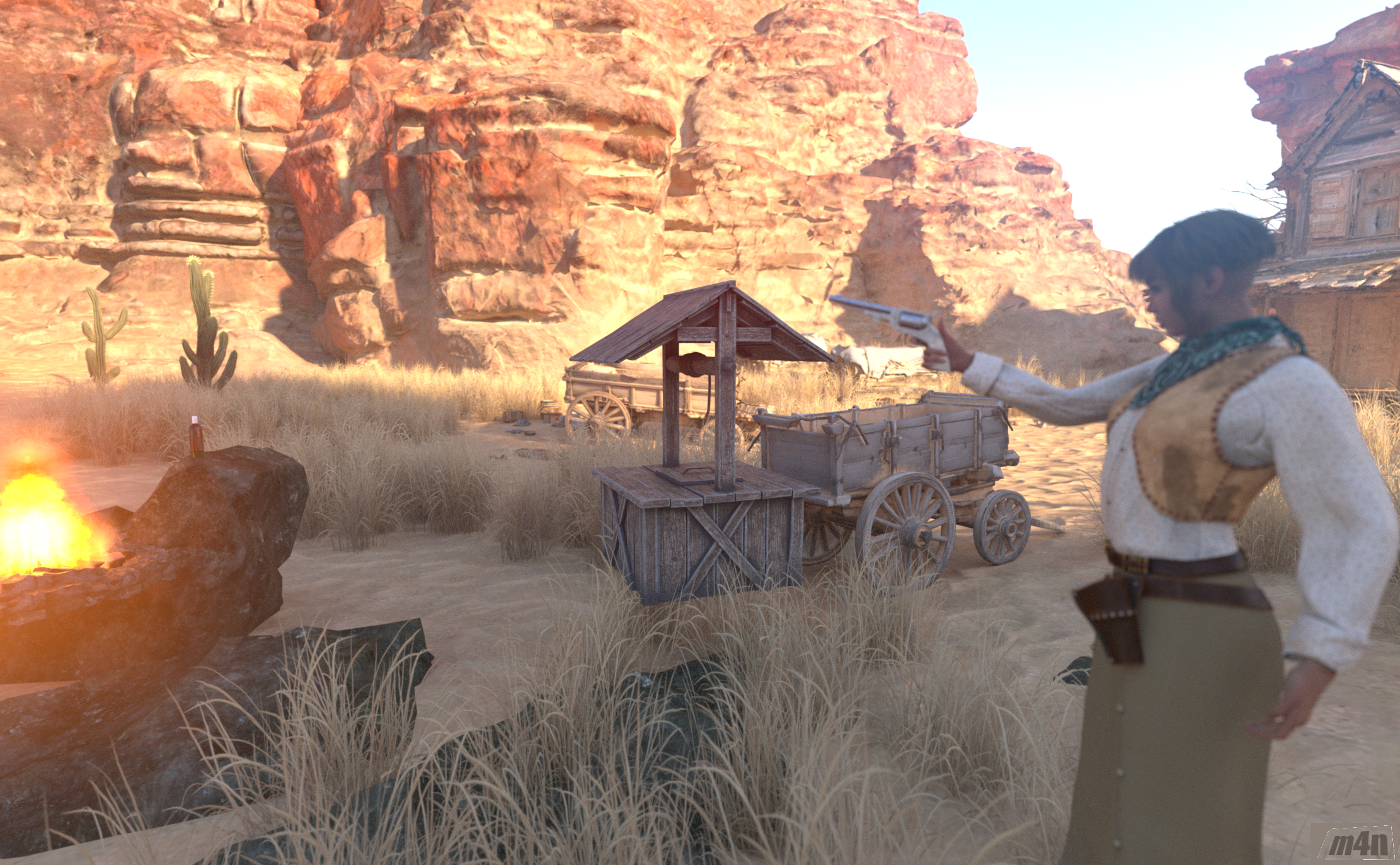 Mit einem Griff zog sie ihren Peacemaker, spannte den Hahn, und in der Stille der Wüste krachte der Schuss. Funken sprangen, das Erz glühte auf – und plötzlich erstrahlte die Nacht in einem Licht, das selbst die Sterne neidisch machte.