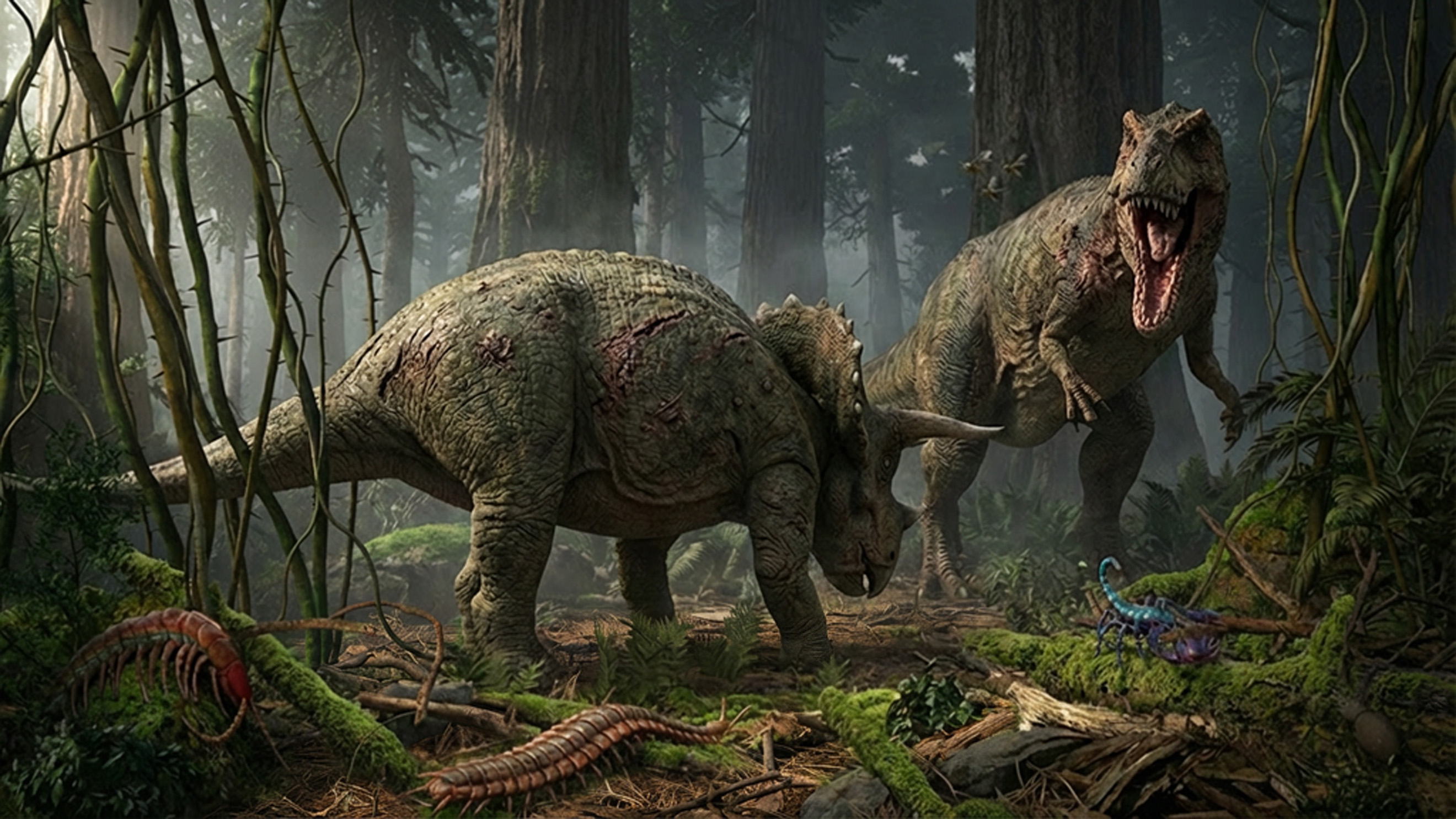 Über die Ostertage habe ich wieder ein altes Bild raus geholt und neue aufgebaut, Viele Riesenbäume gepflanzt. neues Lichtsetup benutzt, :) (macht Laune wenn ma es mal begriffen hat. dann die Dinos mit neuer Haut bemalt. und Verletzungen aufgemalt ( Carrara) .