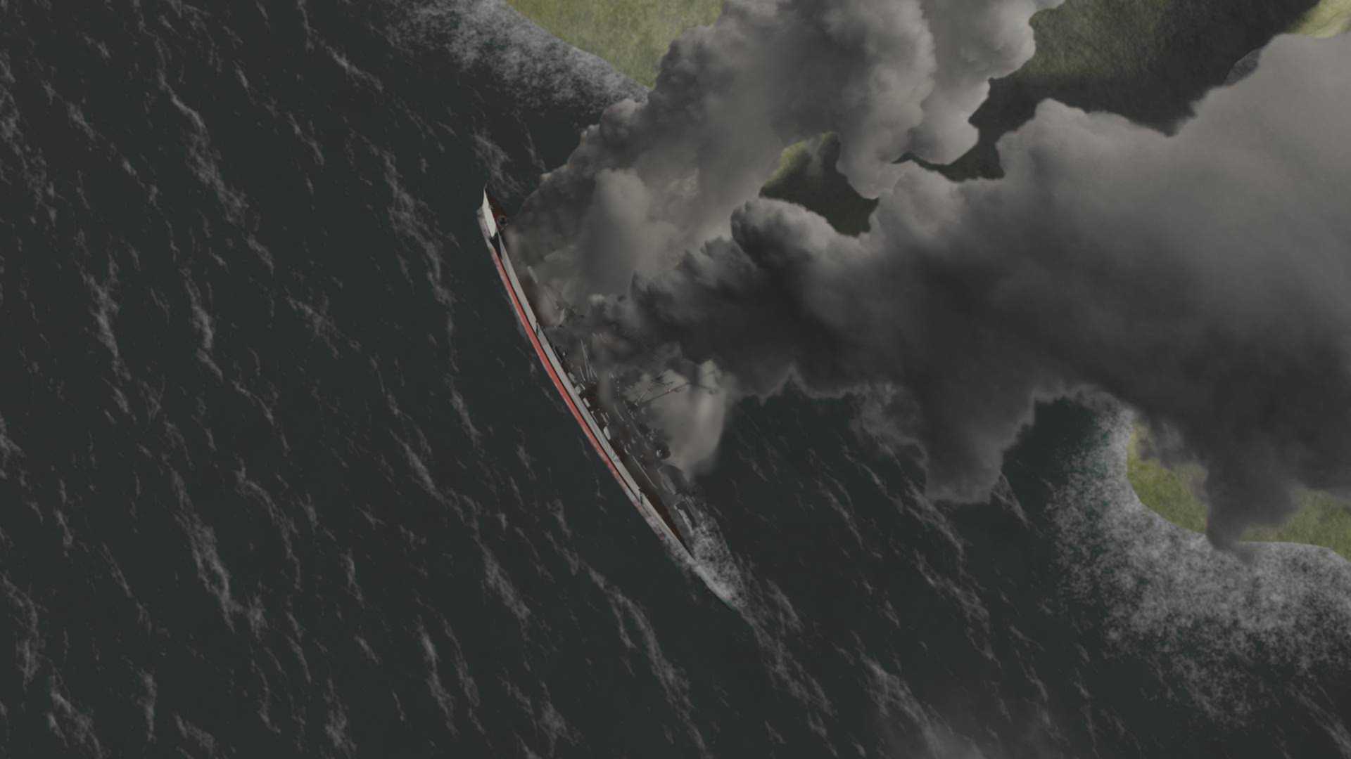 Die Tirpitz neigt sich zur Seite. Sie kentert !