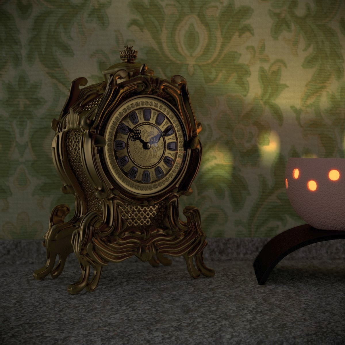 Finalrender der Kaminuhr aus meinem WIP Kleine Schmuckstücke. Verwendete Programme: Blender 2.69, gerendert mit Cycles, Texturen Tapete und Granit von cgtextures.com, Beleuchtung durch ein HDRI von Greg Zaal