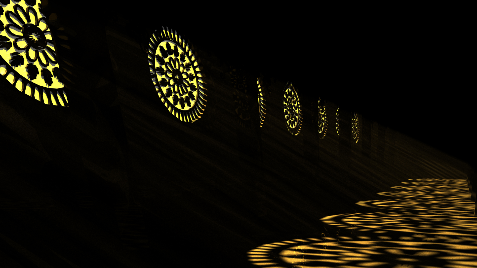Resultat von Experimenten mit Licht und aus Adobe Illustrator importierten Elementen (Fenster). Gerendert in Carrara.