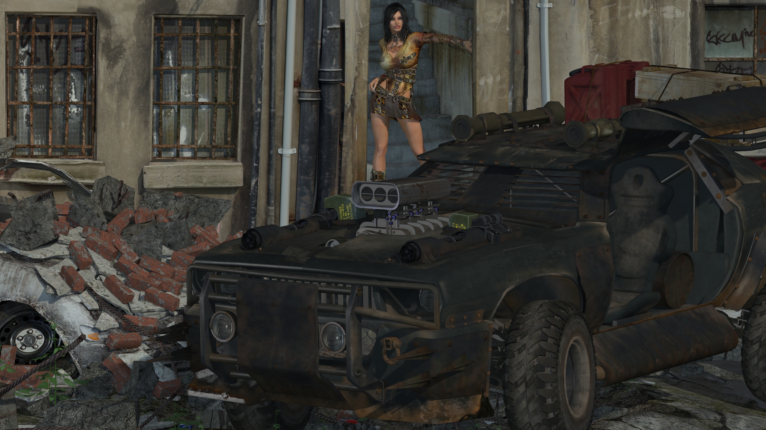 Die Szene wäre super gut, da ich selten so eine tolle Ansammlung an Schutt in einer Szene mit DS (?) gesehen habe, aber der Wagen im Vordergrund müsste anders ausgeleuchtet werden. Da fehlt einfach die Tiefe, die entsteht wenn Schattenwürfe so richtig arbeiten.