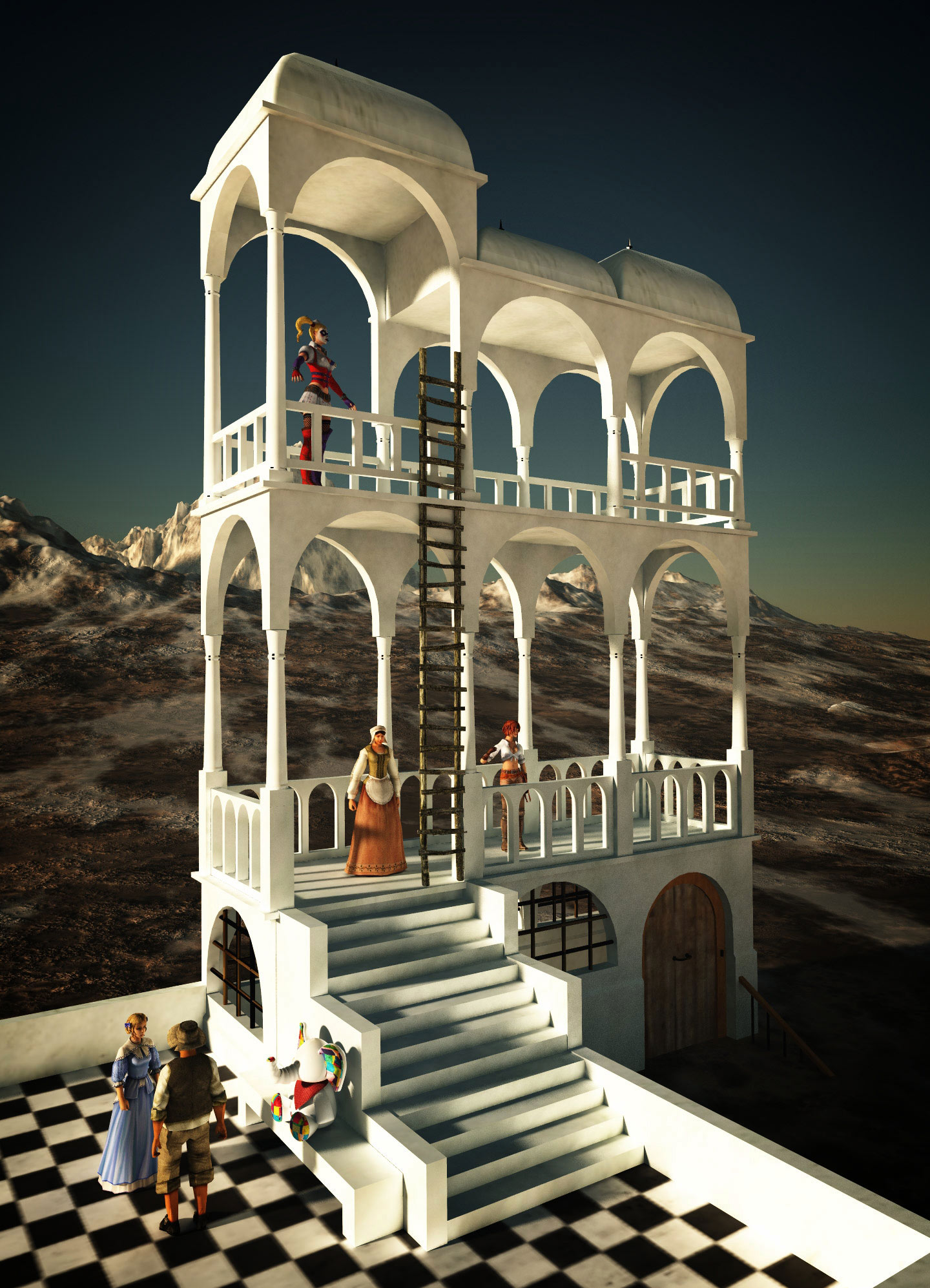 Klasse! Aber der echte Escher-Effekt fehlt. Mach doch den Blickwinkel so wie bei Escher, also das Oberteil um 90 grad drehen und dann brauchst du nur noch mit Photoshop die vorderen Säulen nach hinten und die hinteren Säulen nach vorne zuordnen ....