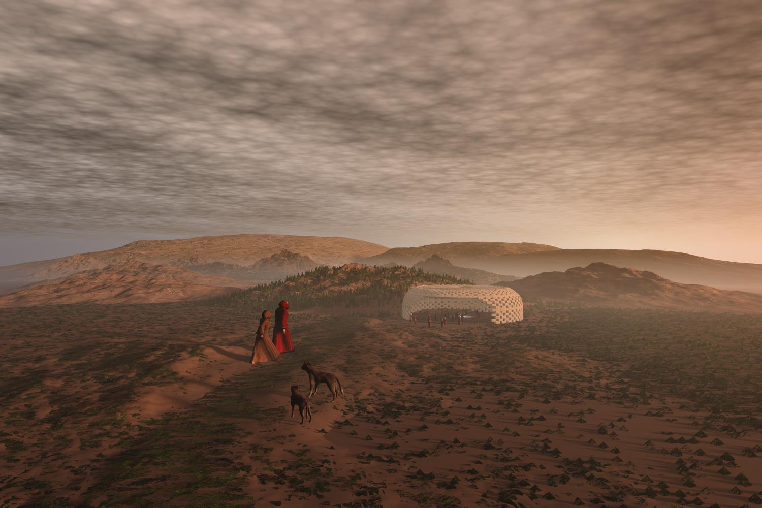 Schließe mich meinen Vorpostern an. Schöne Landschaft . Die Größenverhältnisse machen mir allerdings auch etwas zu schaffen. Die Menschen und auch Hunde erscheinen für die Landschaft im Vordergrund zu groß. Das liegt aber an der Landschaft. Die sieht mehr aus wie eine riesige Halbwüste, die der Betrachter von ziemlich weit oben sieht.