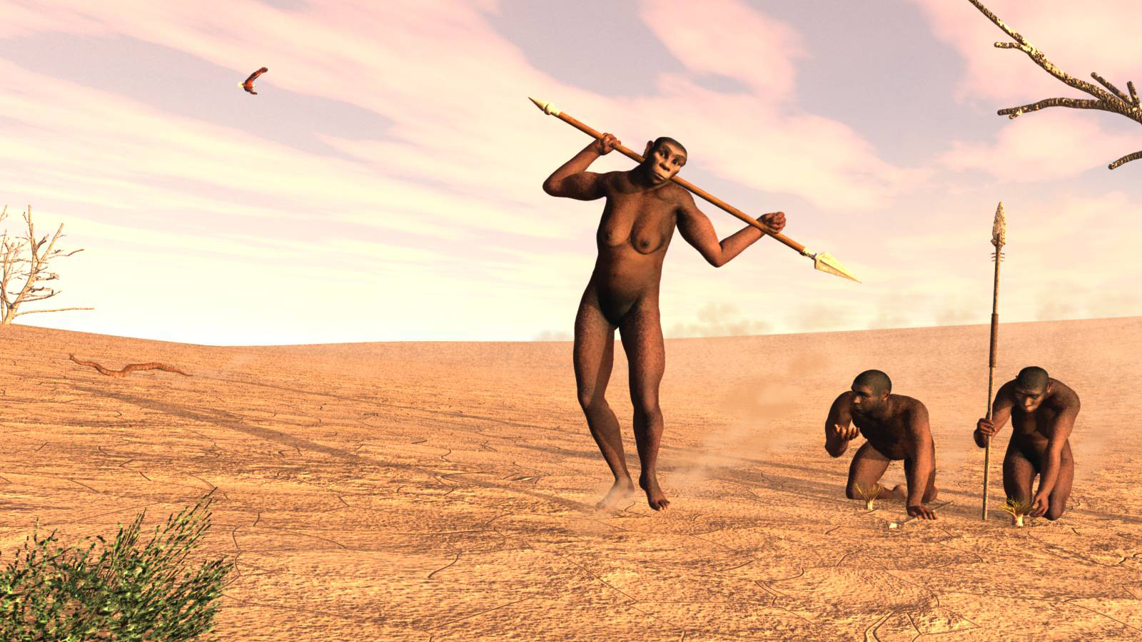 Ein gutes Bild, allerdings viel zu moderne Speere für die alten Körper. Das sind Metallspeere, wie man sie bei Völkern wie den Assyrern oder den Römern finden würde. Man kennt vereinzelt Speere mit einem Alter bis zu 400.000 Jahren, aber die waren nur ein angespitztes Stück Holz. Die "Menschen" sehen vom Körperbau her aus wie Australopithecinen. Von denen kennt man gar keine Werkzeuge. Selbst Faustkeile assoziiert man erst mit Homo erectus und seinen Verwandten.