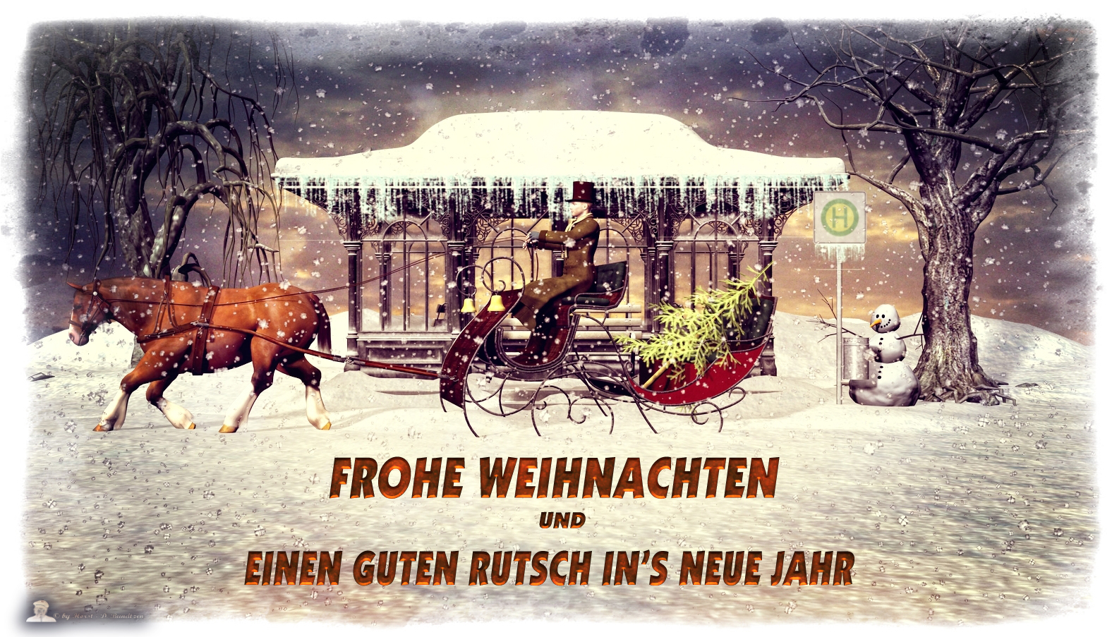 auch wenn bei diesem Wetter zur Zeit kein richtiges Weinachtsgefühl kommen kann, geben wir uns doch alle Mühe das hinter uns zu bringen. - Das Bild oben habe ich in diesem Jahr als Grußkarte für Familie und Freunde gefertigt als und Postkarte ausgedruckt. - Alles in DAZ gefertigt und nur ein ganz klein wenig mit Photoshop aufgehüpst.