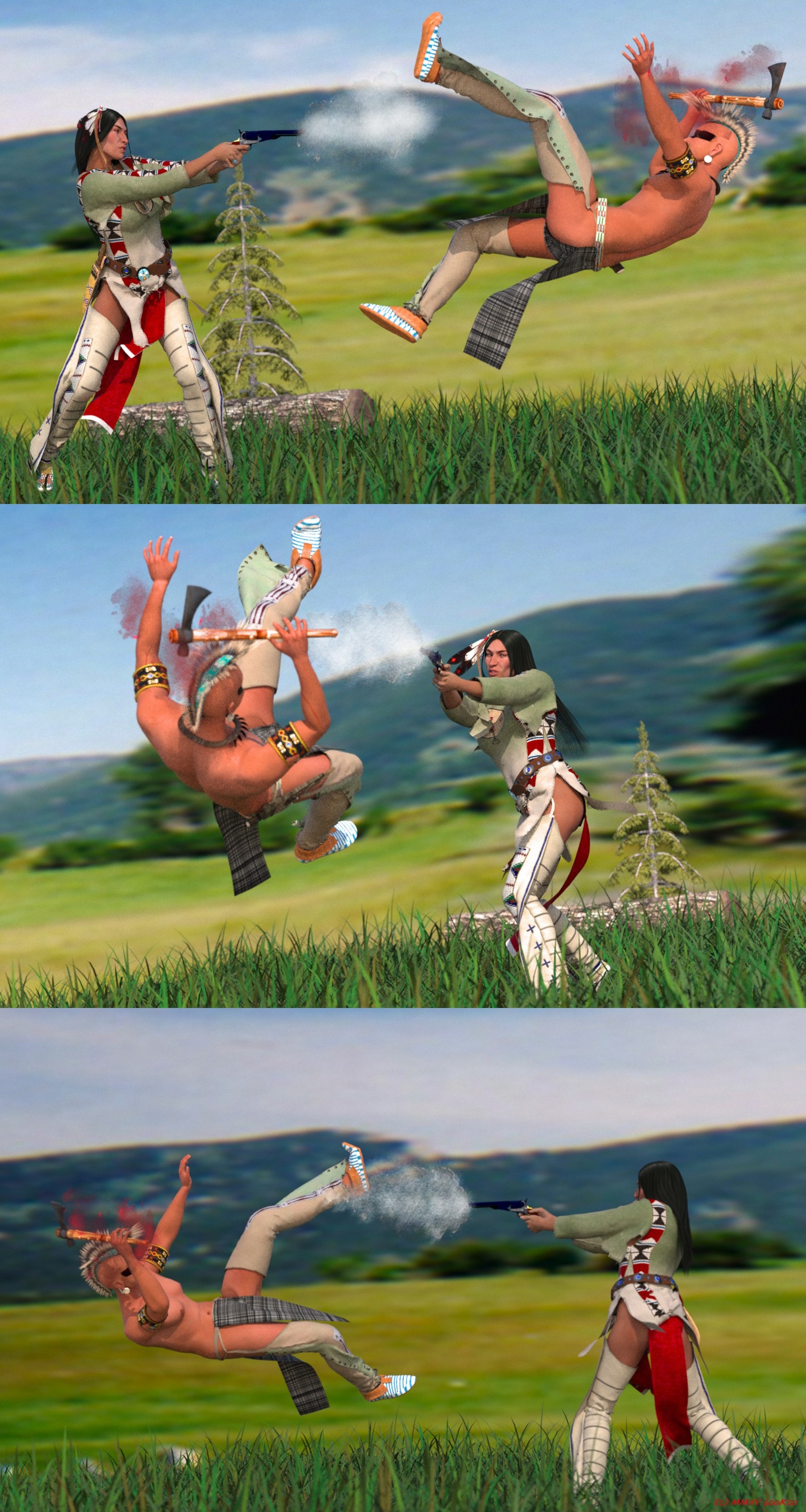 Vor allem wegen der Dynamic durch motion blur Background und das "Reindrehen" der Indianerin in die Schussrichtung plus schräger POV. Das mittlere Bild ist daher mein Favorit. "Unrealistisch" ist ein Bild für mich nur wenn die Abstimmung nicht stimmt, also einige Textur fotorealistisch und andere wieder mehr comic like auftreten.