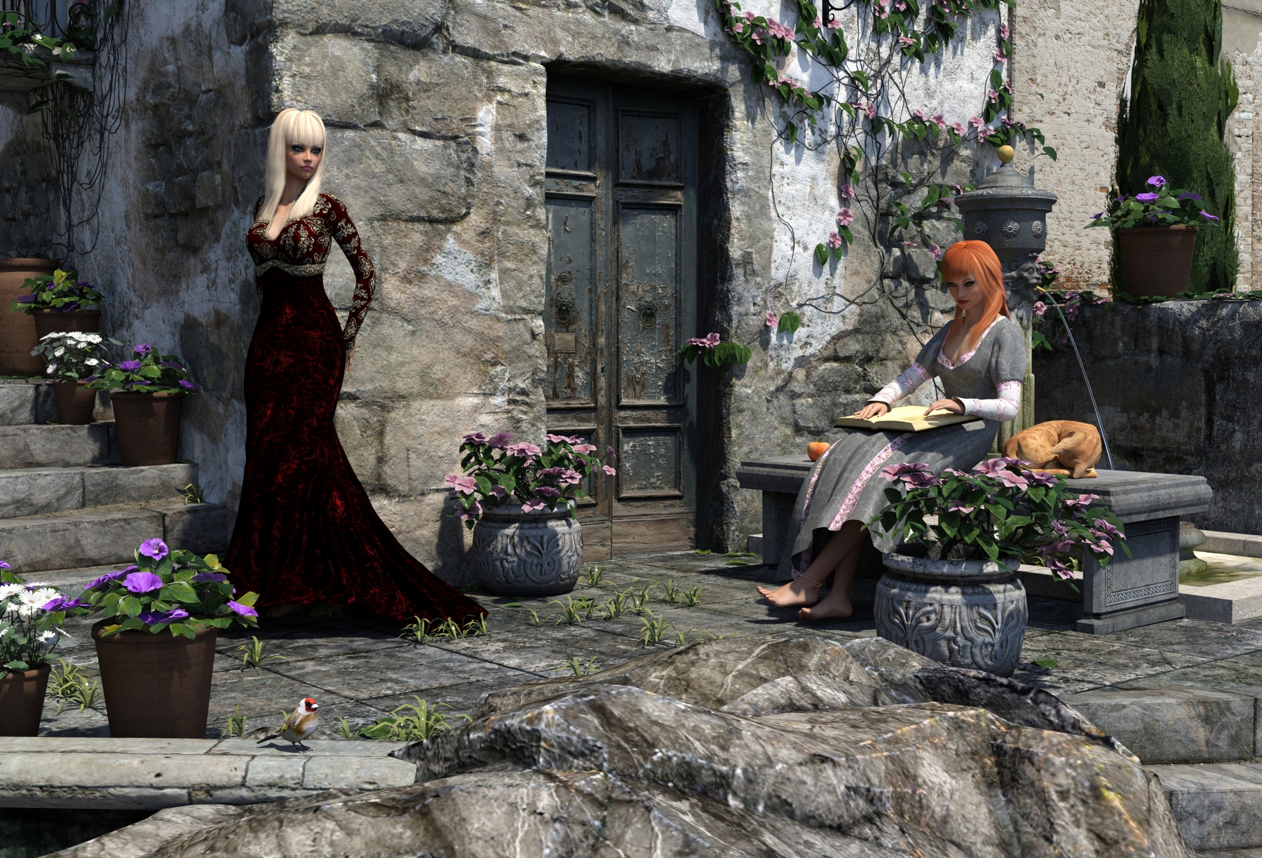Eine schöne, mit viel Liebe zum Detail erstellte Szene. Gefällt mir daher auch wirklich gut. Allerdings finde ich das Licht hier toootal langweilig (sorry!), weil's so gesehen keinerlei 'Stimmung' vermittelt, sondern lediglich 'erhellt'. (Da lässt sich noch deutlich mehr reißen!) Und ein bisschen mehr 'Luft' zu den Seiten hin ('breiteres' Bildformat) würden imho die ganze Szene nicht so 'gequetscht' wirken lassen (und damit wohl auch den Eindruck von 'Idylle' verstärken).