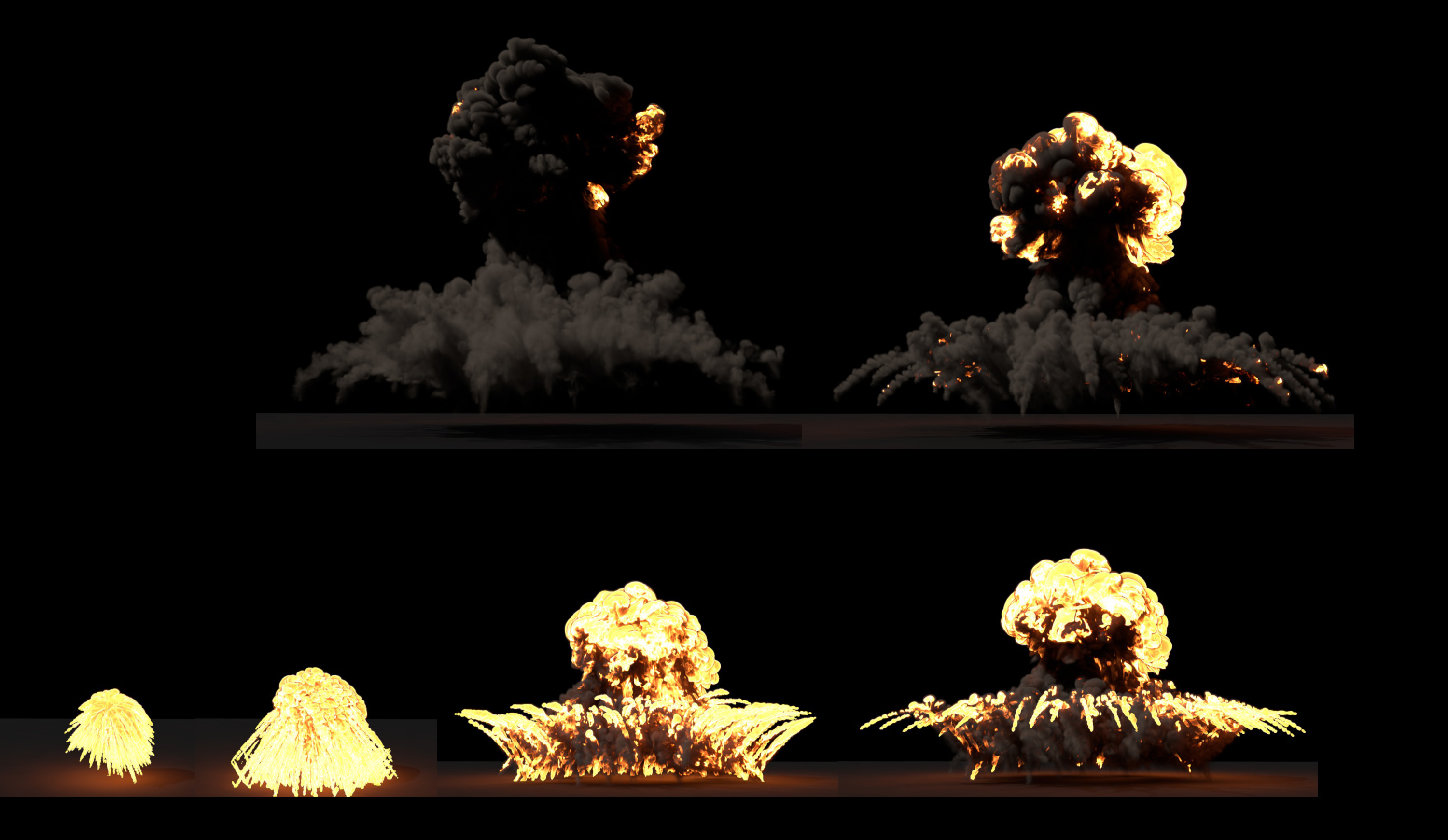 Diese Explosion wird ganz durch Partikel "angefacht", d.h. Ausgangspunkt ist ein Emitter der Partikel von einem Punkt über dem Boden in Richtung der Oberfläche ausgibt, wo die Partikel abprallen und dann von der Schwerkraft wieder hinunter gezogen werden. Die ganze Hitze bzw. Feuer geht von den Partikeln aus, die zuerst feurige, dann Rauch-Spuren hinter sich herziehen. Im Zentrum ist genügend Hitze vorhanden um einen aufsteigenden Feuer-Rauch-Pilz zu generieren.