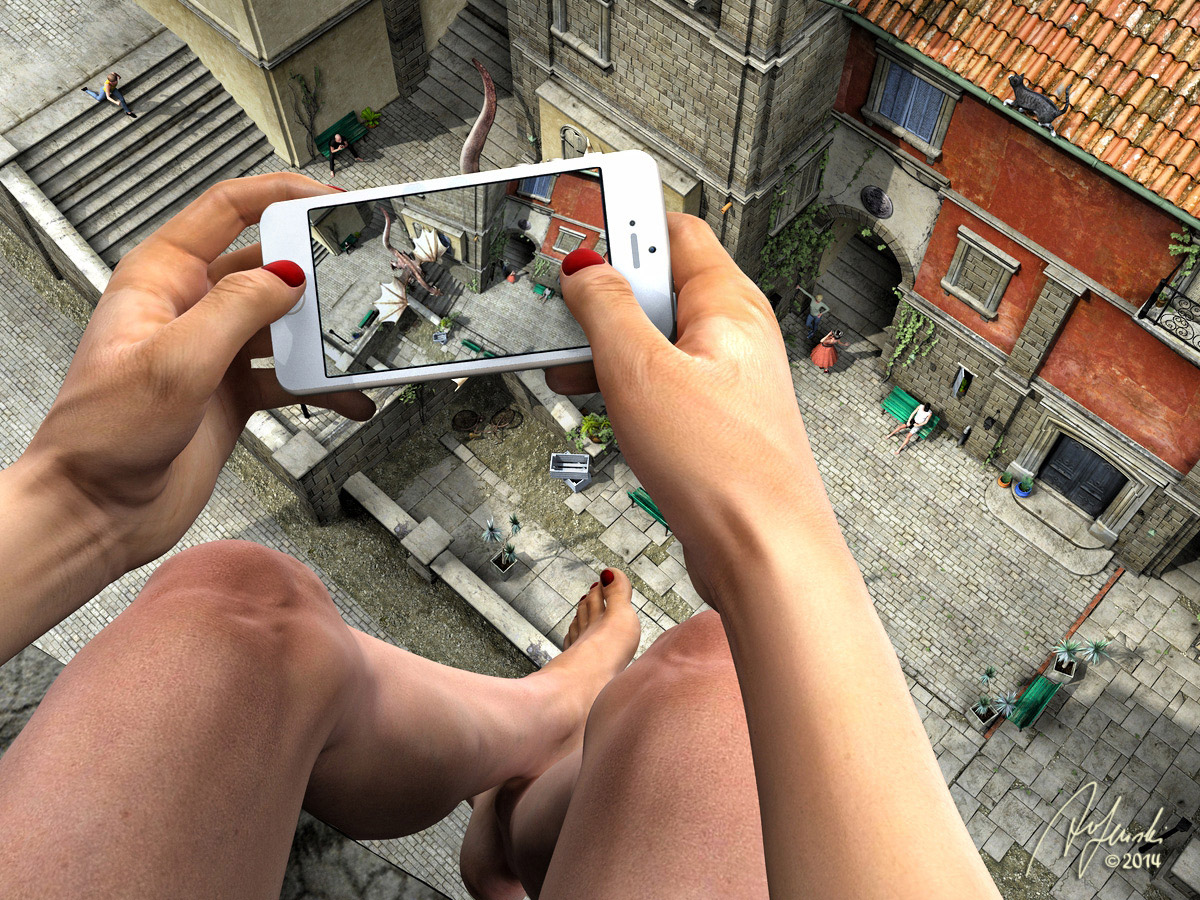 Nachtrag: Der Blick auf ein Bild kann sich bei mehrmaliger Betrachtung ja ändern. Nun ist mir aufgefallen, wie unbeteiligt die Gestalten angesichts des Drachen im Hinterhof sind. Sie bringen Leben in die Szene, schon verstanden, doch scheinen sie von dem Drachen nicht im Mindesten beeindruckt zu sein. Ich wäre zumindest irritiert, wenn da ein Drache im Hinterhof säße. Aber es lassen sich natürlich Welten denken, in denen das nicht so ist ("Hallo, Sie da! Da hockt ein Drache in Ihrem Hinterhof!" - "Ach der, das ist bloß Fifi. Gehört den Nachbarn. Keine Sorge, der will nur spielen."). Aber, wenn ein Drache im Hinterhof derart selbstverständlich ist, warum sollte dann jemand unterstellen, die Aufnahme sei manipuliert? - Ich bin dann zwischenzeitlich einkaufen gegangen. Bei den Zucchini hatte ich dann die Erkenntnis: Es liegt natürlich an dem auffälligen Muster im Pflaster. Da könnte natürlich jemand auf die Idee kommen, dabei handele es sich um eher schlecht gemachte Texturen. - Also ist das Bild doch noch um einiges raffinierter, als ich anfangs dachte.