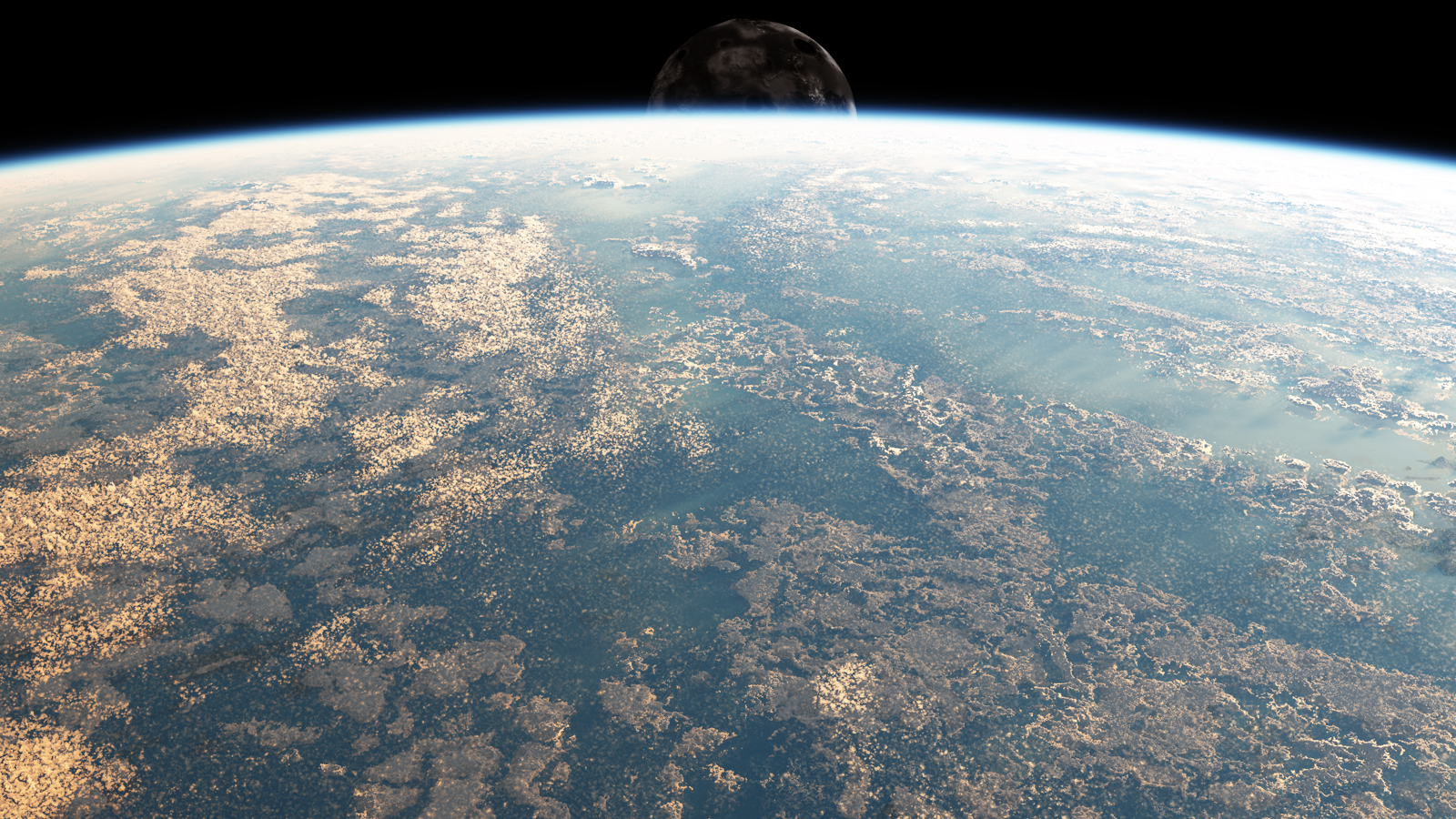 Die Szene besteht neben dem Mondobjekt aus einem kugelförmigen Gelände, ergänzt durch ein Meer. Es gibt zwei Wolkenschichten und die Kamera befindet sich in 300 Kilometern Höhe.