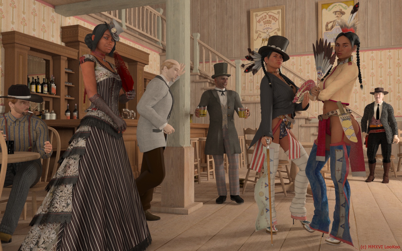 Aphrodite seufzte leise. Normalerweise lief es um diese Uhrzeit wie am Schnürchen. Sie stolzierte in die Nähe der Theke, ließ sich ein paar Komplimente machen und auf einen Drink einladen, flirtete ein par Minuten, flüsterte dann ihren Verehrern ihren Preis ins Ohr und nahm sie dann mit nach oben. Die meisten waren Goldschürfer und in der Regel ungewaschen und grob. Da in diesem Kaff hunderte von Kerlen auf jede Frau kamen, hatten die Freier entsprechend Druck auf der Leitung, so dass die Sache meistens sehr schnell vorbei war. Nach zehn Minuten war sie meistens wieder allein auf dem Zimmer. Aphrodite hatte gelernt, die Dinge nicht an sich heran zu lassen. Sie ignorierte die dreckigen Kommentare und merkte sich aus Prinzip keine Gesichter. Sobald die Kerle die Tür von außen zu machten, erinnerte nichts mehr an sie außer einem Schuss Eiweiß und einer Prise Goldstaub. Hätte sie auf eigene Rechnung gearbeitet, wäre sie längst eine wohlhabende Frau. Das dumme war nur, dass der Goldstaub an Miss Suzie ging, ihre Herrin… Momentan konnte sie das aber eh vergessen. Die roten Weibsbilder da stahlen ihr gerade die Show. Die eine trug einen Hut auf dem Kopf, mit dem ihr fesches kleines Hütchen nicht ganz mithalten konnte, aber das beschrieb den Unterschied nicht mal ansatzweise… Vermutlich hatten die beiden Wilden keinen Schimmer, mit welchen Absichten Frauen hier Drinks ausgegeben wurden. Da steuerte schon der erste Kerl auf die Squaws zu. Aphrodite schmunzelte. Indianer wurden hier aus Prinzip nicht bedient. Eigentlich. Außerdem waren die beiden offensichtlich Hostiles: wilde Aufmachung, gefiedert wie ein Schwarm Truthähne und auch noch bewaffnet mit Messern und Kriegsbeilen – bestimmt Grund genug für so manchen recht schaffenden Bürger des Territoriums, die beiden Rothäute hier sofort über den Haufen zu schießen! Aber das war noch nicht alles. Die beiden auf Böcke getrimmten Squaws trugen ganz offensichtlich Plünderware zur Schau: Die von der einen Rothaut getragene kurze Jacke stammte offensichtlich aus einer zivilisierten Schneiderwerkstatt. Die andere schoss völlig den Vogel ab: Den feinen Damenfächer hatte sie bestimmt nicht vom Indianeragenten zugeteilt bekommen, ihr Zylinder und Gehrock erinnerte verdächtig an die Kleidung, in der der seit Wochen vermisste Bezirksrichter zuletzt gesehen worden war, und der Stars-and-Stripes-Tuchstreifen, der ihren Unterleib nur höchst unvollkommen verhüllte, erinnerte verdächtig an eine Kavallerie-Standarte… Allerletzte Zweifel verflogen, als Aphrodite den Grund für die so unindianisch klappernden Schrittgeräusche der Frauen erspähte. Was die beiden Prärietöchter sich da über ihre Moccasins geschnallt hatten, waren die Spezialanfertigungen aus Paris, die Miss Suzie für die Mädels im Tanzsalon nebenan bestellt hatte… Aphrodite schmunzelte. Die anwesenden Herren schienen das weder zu wissen noch zu erahnen und hatten offenbar nur Augen für den Umstand, dass da zwei sehr ansehnliche Eingeborenenmädchen keine Röcke trugen. Verpetzen würde sie die beiden jedenfalls nicht. Die lebten auch so schon wild und gefährlich genug. Jetzt musste sie wieder seufzen. Was sie spürte, war Neid…