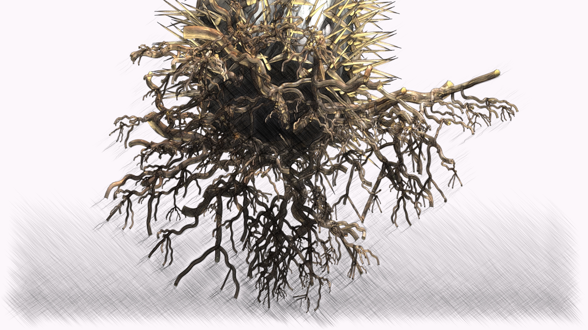 Die Kaktuswurzel aus der Serie "Virtuelle Pflanzenwelt" ist ein 3D Objekt das in eine 2D Zeichnungen bzw. Aquarell ahnliche Arbeit gewandelt wurde.