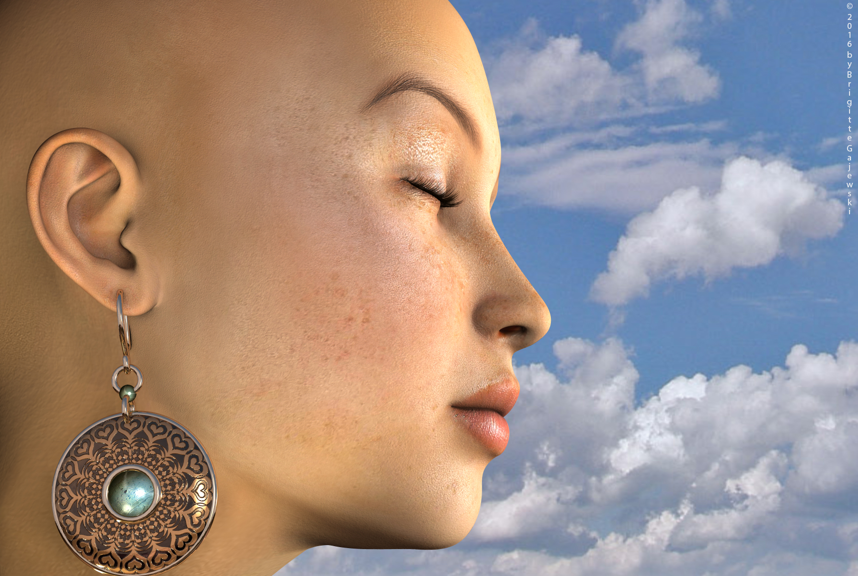 Schönes Gesicht und Textur . Coole Frisur passend zum momentanen Wetter und absolut pflegeleicht. Das Ohrläppchen müsste allerdings bei dem Riesen-Klunker etwas mehr nach unten gezogen sein.
