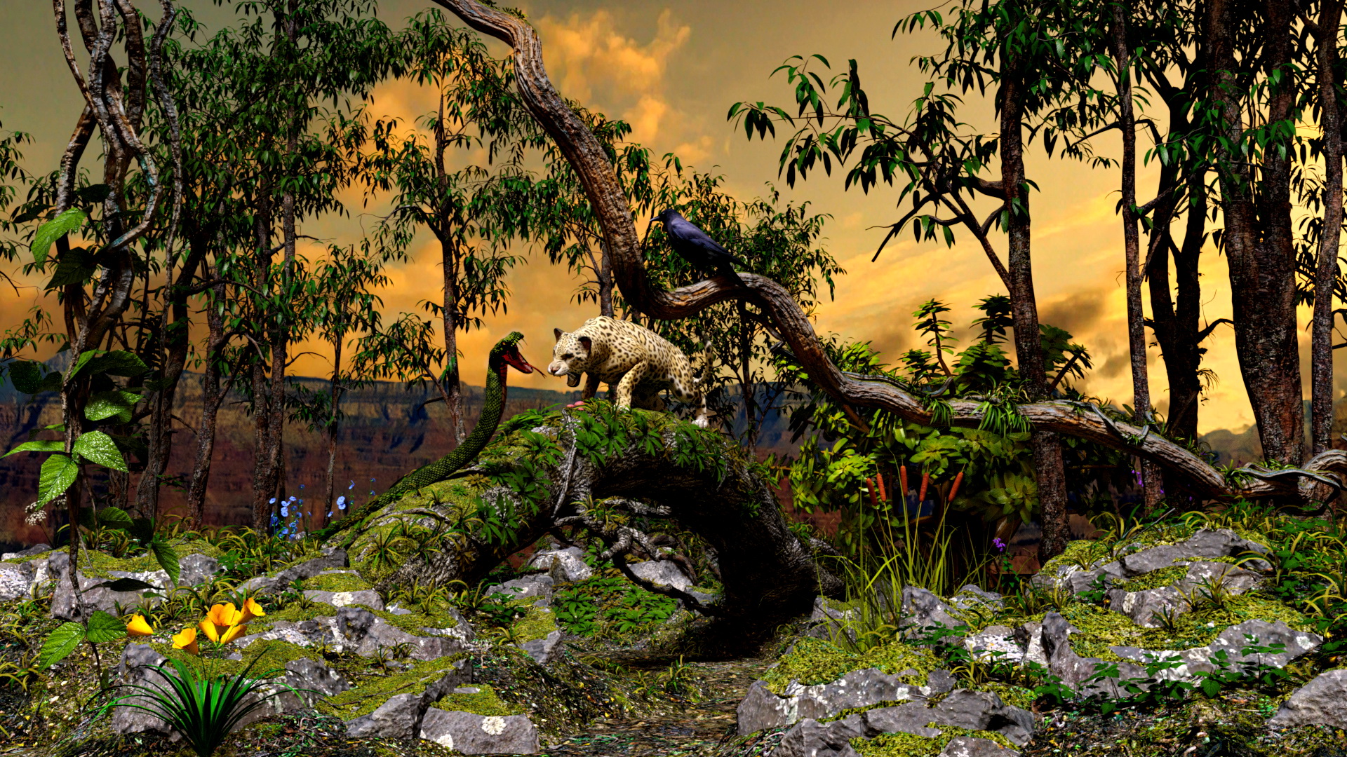 • Ach, ich glaube die Treffen sich nur, fauchen sich gegenseitig an und gehen bzw. schlängeln ihrer Wege. Der Rabe (?) hätte zumindest einen Logenplatz falls es doch scheppern sollte zwischen den beiden. Die Steine+Bewuchs und Bäume kommen gut. Ich wollte schon fragen "mit Vue gebastelt?", aber die Tags lauten DAZ und Iray. Die Schlange ist ein wenig zu grün.