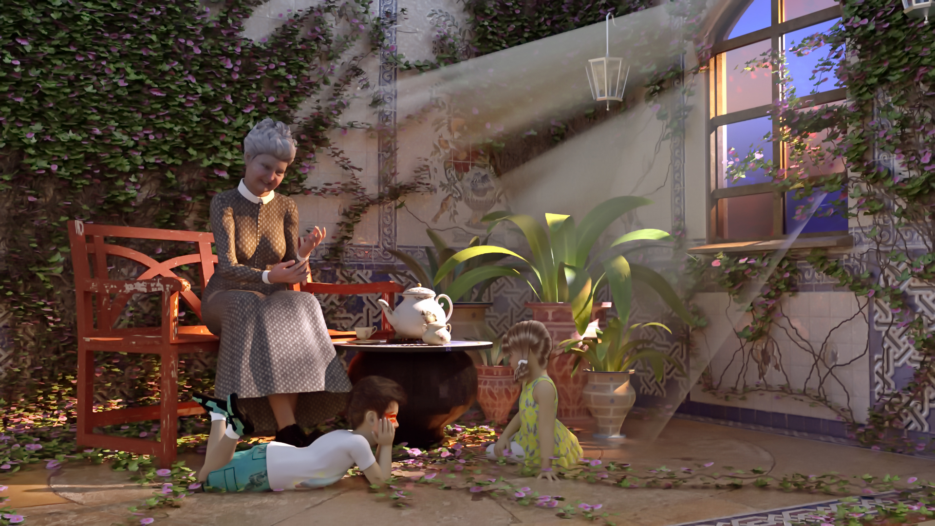 • Die Kacheln lassen auf einen mediterranen Innenhof schließen. Die Szene gefällt mir :thumbup: Kleine Nörgelei: der Lichteinfall ist zu scharfkantig und zu deckend ;)