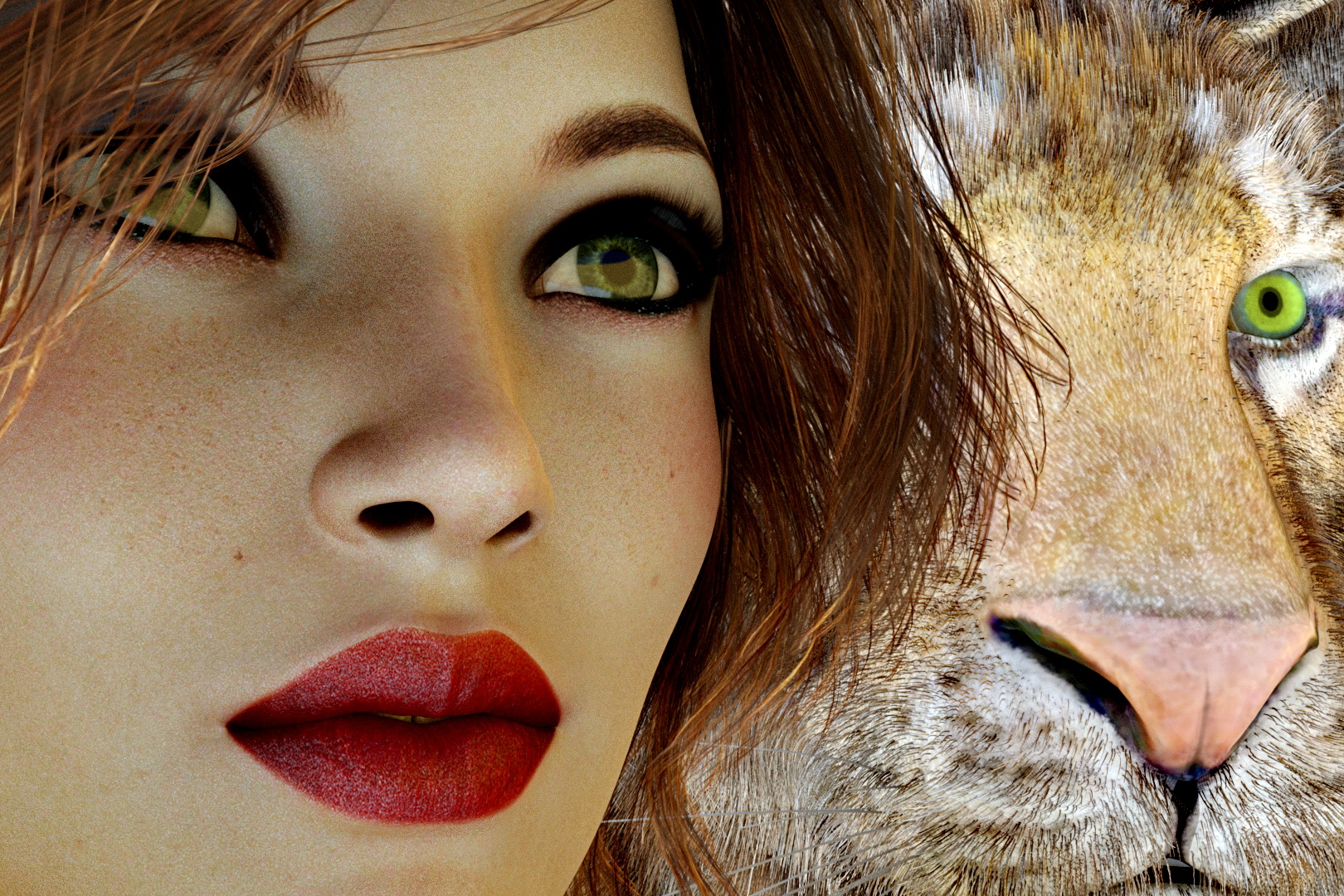 mach doch mal n Morph aus Frau und Tiger. Ist bestimmt interessanter anzuschaun. Die augen der Frau sind aber heftig geteert. Die "Kuschelkatze" hätt ich gern als Haustier. Zumal das Futter auf zwei Beinen zahlreich umherläuft. Und da kein Mangel besteht.