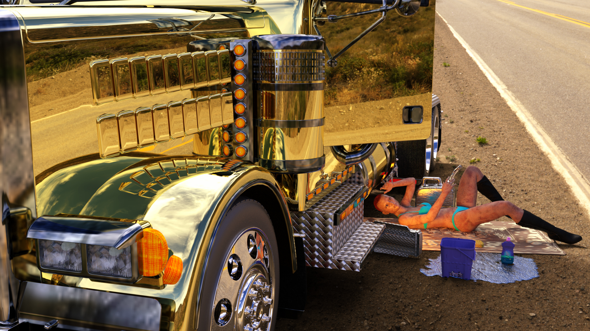 Warum ist der Truck so sauber und sie so dreckig?....... typischer Männertraum. Das Gespiegel kommt gut .