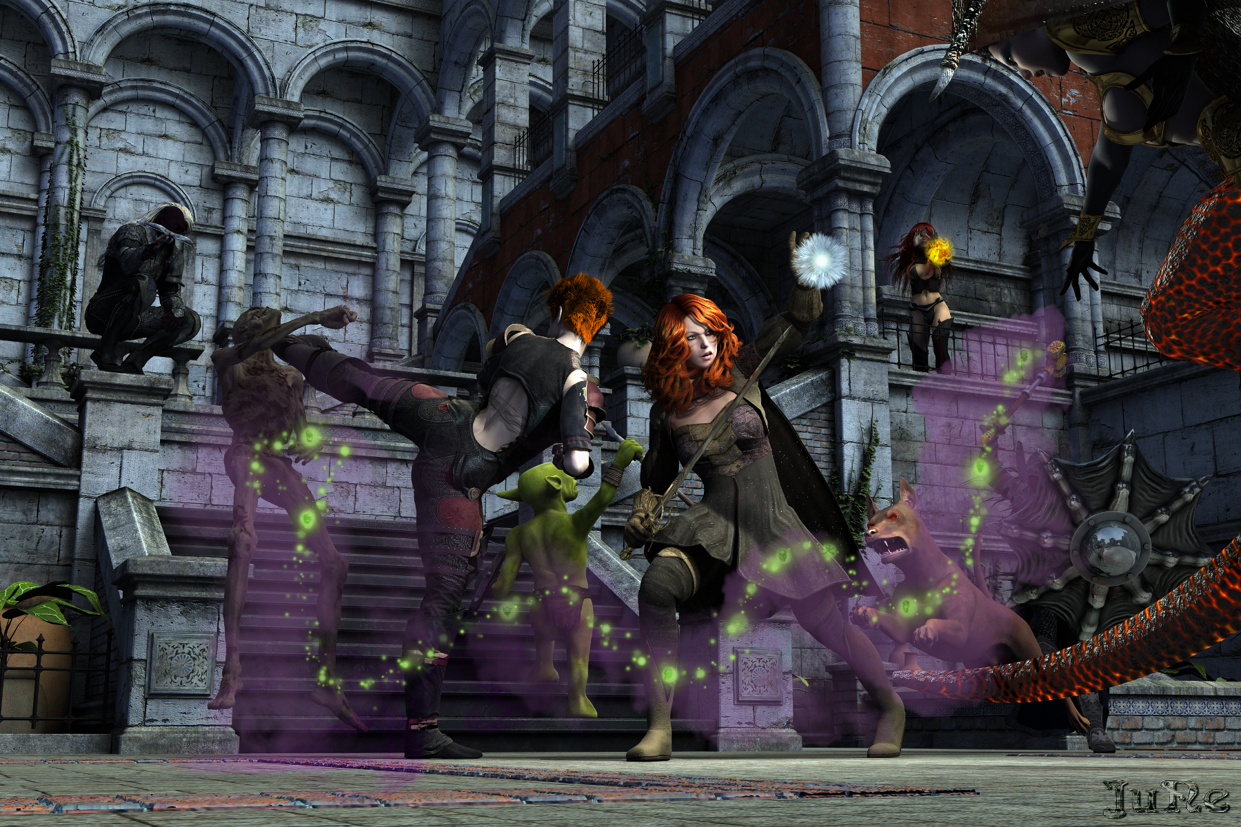 Deswegen schien keiner wirklich überrascht, als mehrere Gestalten aus den Türen kamen und ohne weitere Vorwarnung angriffen. Der Goblin sprang von seinem Reithund und lief die Treppe hinauf, wo Deny schon dabei war, flammende Vernichtung auf die Angreifer herabzurufen. Die Halbdrachin erhob sich in die Luft, sprach einen Spruch, und auf einmal peitschte eine Kette grüner Lichter durch den Hof, Wolken widerlichen purpurnen Rauchs zurücklassend. Wo die Lichter den Boden berührten, erhob sich ein Zombie. Arsinoë lachte nur und sandte ihn mit einem kräftigen Tritt quer über den Hof. Der Reithund des Goblins ging auf Talinna los, die jedoch die Halbdrachin als gefährlicher ansah und daher ihren Zauber gegen diese richtete. Ilmig sprang ein und griff den Teufelshund von hinten an. Während sie ihre Freunde noch anfeuerte, sah Talinna den Bolzen des Dunkelelfen sein Ziel in der Schwinge der Halbdrachin finden. Diesen Kampf würden sie gewinnen.