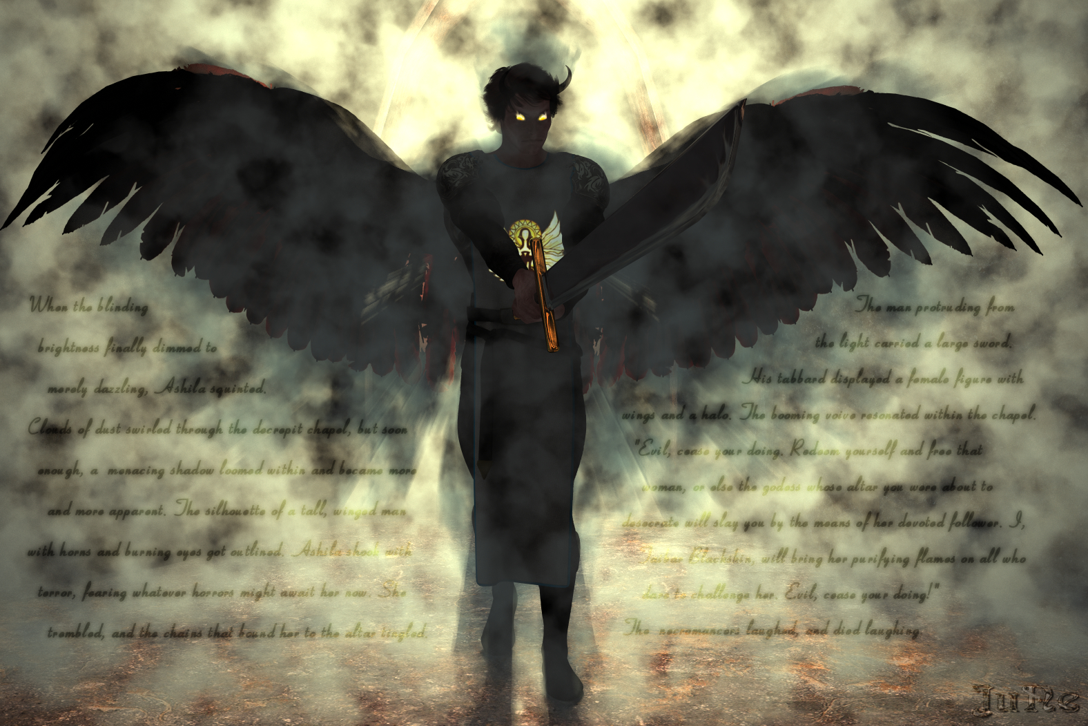 "Als das blendende Licht sich schlussendlich zu lediglich grell abmilderte, blinzelte Ashila. Staubwolken zogen durch die heruntergekommene Kapelle, doch bald genug zeichnete sich ein bedrohlicher Schatten darin ab und wurde immer sichtbarer. Die Silhouette eines großen, geflügelten Mannes mit Hörnern und brennenden Augen erschien. Ashila bebte vor Angst, fürchtend, was für ein Horror nun auf sie zu käme. Sie zitterte, und die Ketten, die sie an den Altar banden, klingelten. - Der Mann, der aus dem Licht trat, trug ein großes Schwert. Sein Wappenrock zeigte eine weibliche Figur mit Flügeln und Heiligenschein. Seine dröhnende Stimme hallte in der Kapelle wider. "Böses, beende dein Tun. Erlöse dich und befreie die Frau, oder die Göttin, deren Altar du gerade schänden wolltest, wird dich durch ihren treuen Diener vernichten. Ich, Taibar Schwarzhaut, werde ihre reinigenden Flammen über jeden bringen, der sie herausfordert. Böses, beende dein Tun!" Die Nekromanten lachten, und starben lachend."