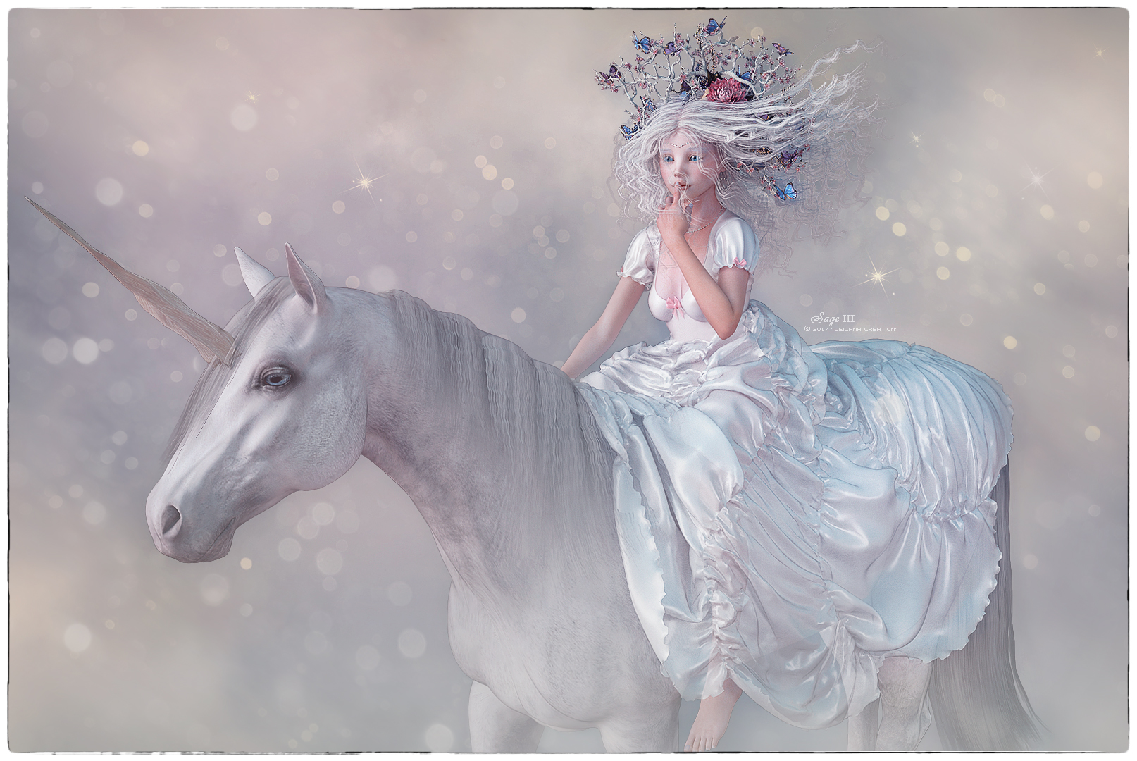 Die Stoffdrapierung ist in der Tat seeehr eindrucksvoll. Finde gerade irgendwie, dass diese 'Einhorn-Nummer' vielleicht ein biiisschen zu viel des Guten ist .. denke, ohne Horn würde das Ganze einen nicht ganz so 'zuckersüßen Sirup'-Eindruck erwecken .. und vielleicht auch mehr Spielraum für's 'Kopfkino' lassen. Imho könnte der PoV auch ein bisschen optimaler sein (Kamera etwas tiefer). Dennoch: hübsch!