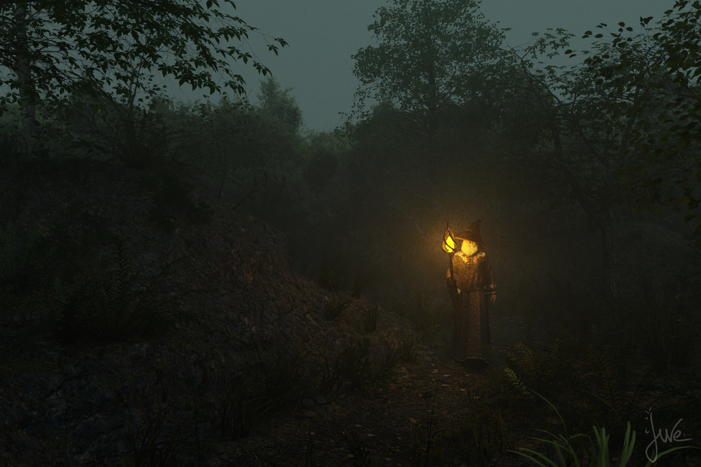 Ich hatte eigentlich nur ausprobieren wollen, wie das mit der Atmosphere-Cam nun geht, und mal das Through the Woods verrendern wollen... Mal sehen, vielleicht render ich den Boden noch mal neu mit ein paar Pfützen.